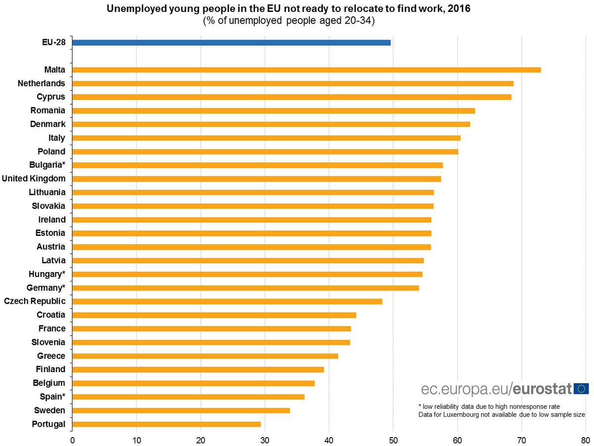 E infatti non emigrano, come registra con statistico disappunto Eurostat, che proprio oggi ha pubblicato questa rappresentazione edificante dei nostri giovani disoccupati.