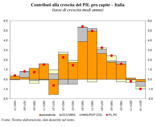 Interessante osservare anche il confronto con altri paesi, in particolare Germania, Francia, Spagna, Gran Bretagna e Usa. Emerge che “in Italia il contributo della produttività alla crescita del prodotto pro capite è per quasi tutto il Novecento più alto della media degli altri paesi, diviene significativamente negativo nel primo decennio del nuovo millennio”. In generale “il contributo della struttura demografica italiana è