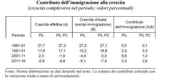 decisamente negativo e inferiore agli altri paesi avanzati” che sarebbe stato anche peggiore “se non fosse intervenuto negli ultimi 25 anni un significativo flusso migratorio in entrata”. Nel 1981 i cittadini stranieri residenti in Italia erano poco più di 200.000, lo 0,4 per cento della popolazione, mentre sono diventati poco più di 5,1 milioni all’inizio del 2018, l’8,4 per cento della popolazione. L’immigrazione ha avuto effetti positivi sulla crescita, per la semplice ragione che ha aumentato il numero di persone in età lavorativa.