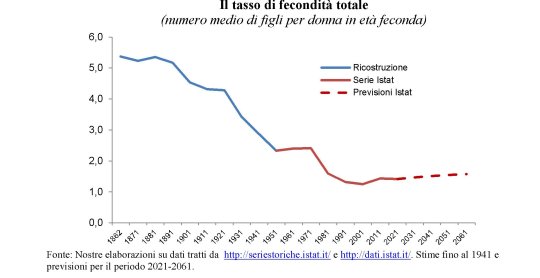 Il dato è sconfortante perché non rappresenta un episodio, ma una chiara tendenza confermata dalle rilevazioni Istat. Il paper di Bankitalia ci consente di avere una buona visione d’insieme nel lungo periodo. Il tasso di natalità in Italia ha un andamento declinante ormai secolare.