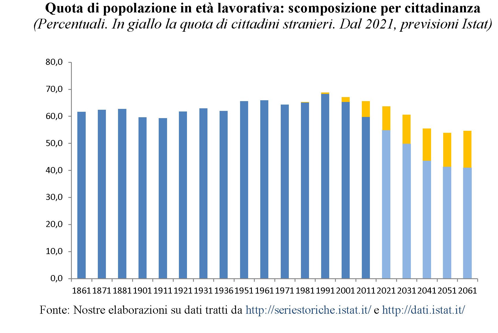 Ci sarebbe da chiedersi come mai il cambiamento strutturale della nostra popolazione, che ha condotto i più anziani a superare i più giovani, si sia innescato dal secondo dopoguerra per accelerare vistosamente dalla fine degli anni ’80. Ma il discorso ci porterebbe troppo lontano. Ci basti sapere che nel 2017 gli anziani sono il 165% dei giovani 0-14 enni, e tale rapporto è previsto in crescita. Ciò impatterà sul totale delle persone in età lavorativa, che diminuisce da venticinque anni. L’immigrazione contribuirà a rallentare questa flessione. Si stima che nel 2061 un quarto della popolazione in età lavorativa sarà composta da stranieri. Se così non fosse, la quota dei 15-64enni, ossia la popolazione in età lavorativa, scenderebbe al 40% del totale. Ma pure con l’ingresso degli stranieri non si supererà il 55%.