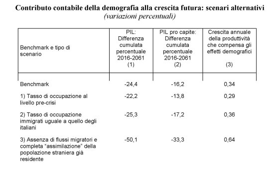 Nello scenario benchmark, “l’effetto meccanico delle dinamiche demografiche determinerebbe in 45 anni un calo del PIL del 24,4 per cento rispetto ai livelli del 2016 e del 16,2 per cento in termini pro capite (-0,4 medio annuo), a parità di altre condizioni”. Se si azzerasse l’immigrazione (scenario 3) “il livello del PIL aggregato risulterebbe dimezzato con un calo del 50 per cento (a fronte di -24,4 per cento nel caso benchmark)”. Il livello del reddito pro capite sarebbe un terzo rispetto al livello del 2016.