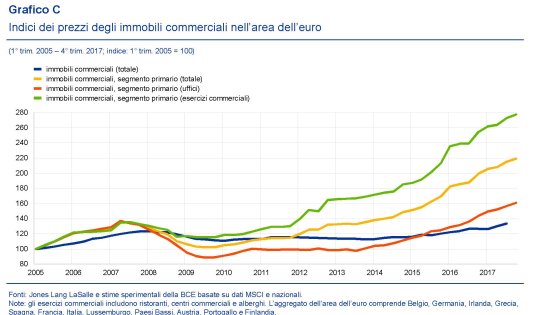 prezzi degli immobili commerciali nell’area è salito al 5,1 per cento, dal 3,8 del 2015 e dall’1,9 per cento del 2014. Tale aumento dei prezzi è stato trainato dal segmento primario del mercato immobiliare commerciale (in cui i prezzi hanno registrato una crescita tendenziale del 18 per cento nel 2016, rispetto al 14 per cento dell’anno precedente) e, in particolare, dal segmento primario degli esercizi commerciali, in cui i prezzi hanno continuato a salire anche nel 2017.