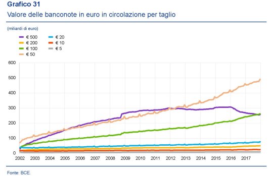 internazionali”. Notate che le banconote da 500 euro, che la Bce ha smesso di produrre da maggio 2016, anche per il timore che favorissero transazioni illecite, sono state superate in valore solo di recente da quelle di 50 e sono state raggiunte da quelle da 100. Insomma: i grossi tagli che si vedono molto poco sono ancora molto utilizzati nei circuiti di pagamento.