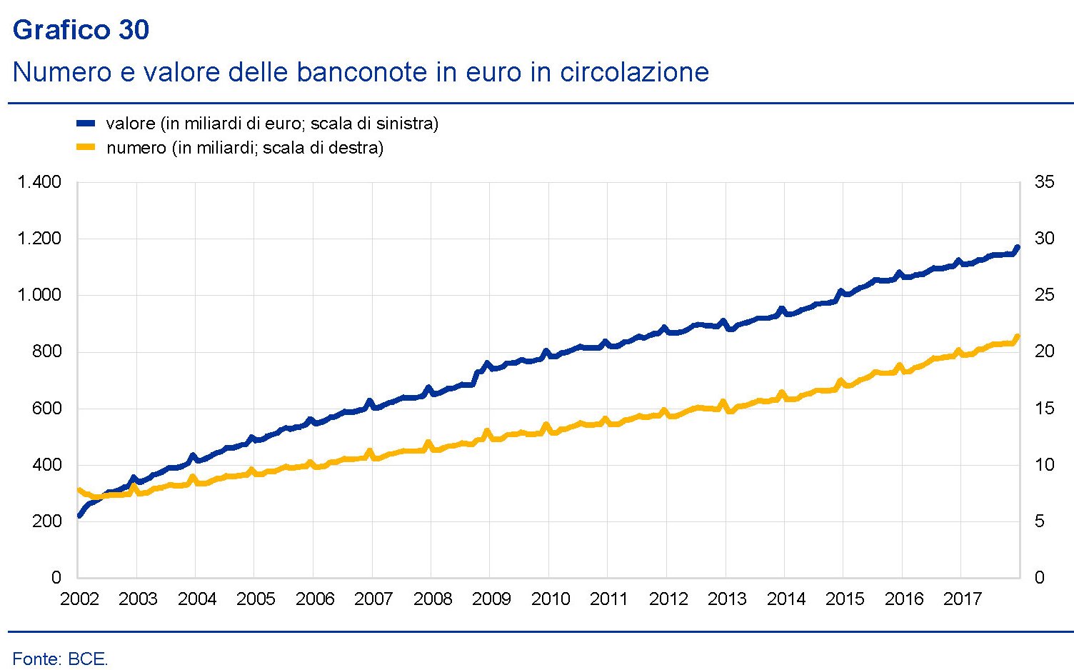 In particolare, nel 2017 il volume e il valore dell banconote sono cresciuti rispettivamente del 5,9 e del 4%. A dicembre scorso erano in circolazione 21,4 miliardi di banconote per un valore che sfiorava i 1.200 miliardi (1.170) e che li supera abbondantemente se ci mettiamo dentro anche le monete (126 miliardi). Se guardiamo alla distribuzione dei tagli, quello che ha registrato la domanda più forte è stato quello di 100 euro – non proprio comune fra i cittadini normali – cresciuto del 7,9%, persino superiore all’aumento di domanda delle banconote da 50 euro, di sicuro assai più diffuse (+6,4%).