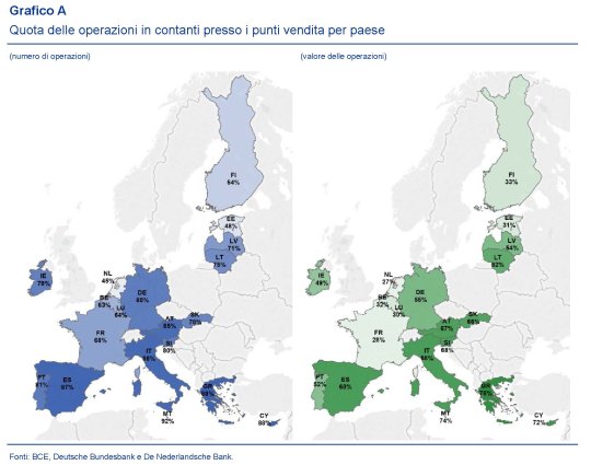 Altra osservazione che vale la pena sottolineare: “Nell’area dell’euro, il contante è stato lo strumento di pagamento più diffuso per le operazioni fino a 45 euro. Le carte sono risultate il mezzo di pagamento utilizzato più spesso per importi superiori a 45 euro. Tuttavia, soltanto il 9 per cento di tutti i pagamenti registrati aveva un valore superiore ai 45 euro”. Inoltre “il fatto che la maggior parte delle operazioni sia avvenuta in luoghi dove i pagamenti in contanti rappresentano tra l’80 e il 90 per