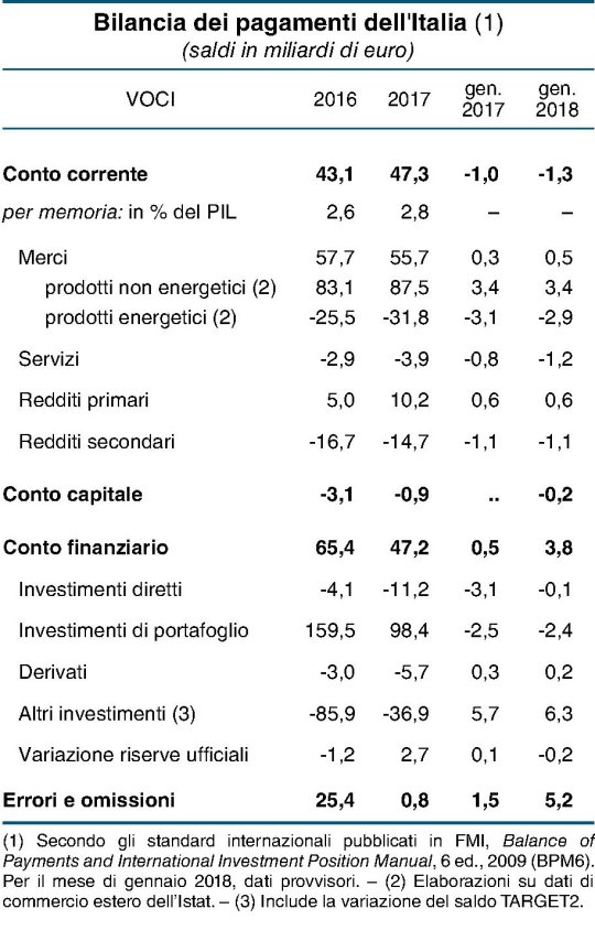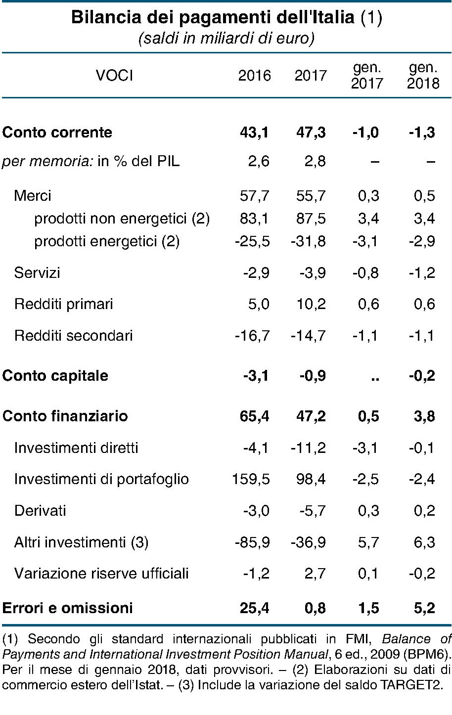 A tal proposito va segnalato che il buon andamento delle esportazioni, cresciute del 5,4% complessivamente nel 2017 a fronte di un +2,4% nel 2016, deve molto alle performance del settore farmaceutico e dei mezzi di trasporto. Purtroppo tale andamento positivo ha iniziato a dimostrare qualche incertezza a inizio di quest’anno, nel corso del quale l’export si è ridotto sia verso Ue che extra Ue. In ogni caso nel 2017 il conto corrente ha registrato un surplus di 47,3 miliardi, pari al 2,8% del pil (era il 2,6% nel 2016).