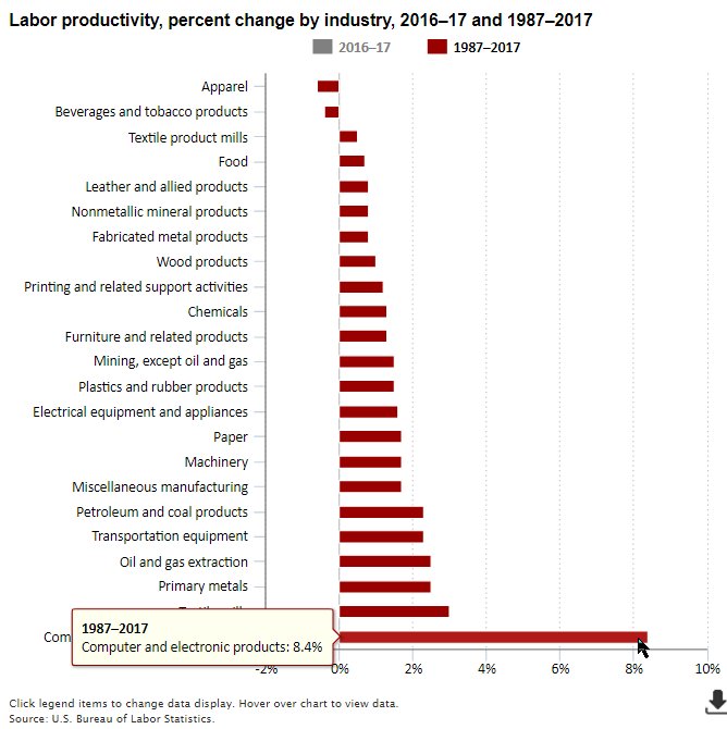 Ed eccolo qua, sotto i nostri occhi il miracolo del nostro tempo economico: il settore industriale computer e prodotti elettronici, che negli Stati Uniti, ha visto crescere la produttività del lavoro di oltre l’8 per cento in trent’anni, quattro volte in media l’incremento osservato negli altri settori, che, in linea con un’economia che stagna, arrancano. Per capire questo miracolo dobbiamo guardare un altro dato, secondo il quale fra il 2006 e il 2016 l’economia digitale ha espresso appena il 3,9 per cento dell’occupazione Usa, garantendo però stipendi pari al 6,7 del monte totale delle retribuzioni. Detto in altro modo, l’economia digitale crea pochi posti di lavoro, ma ben pagati. Questi lavoratori, pur essendo pochi, nel 2016 hanno prodotto il 6,2 per cento del pil statunitense, e così il dato si spiega aggiornando un vecchio slogan. I miracolati dell’economia digitale lavorano in meno, ma lavorano (e guadagnano) per tanti.