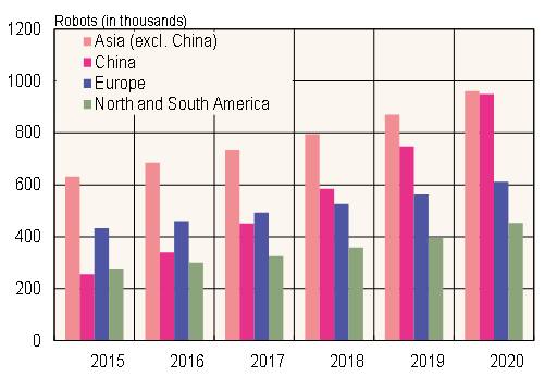 Altri dati serviranno a dimensionare bene il fenomeno. Sempre nel 2016, l’Asia “impiegava” circa un milione di robot, un terzo dei quali in Cina. L’Europa ne aveva in servizio circa 460 mila e le Americhe circa 300 mila. gli esperti prevedono che in Cina i robot industriali arriveranno a quasi un milione entro un paio d’anni segnando un passo di crescita inarrestabile che condurrà in paese quasi a superare il totale dei robot industriali degli altri paesi asiatici. L’Occidente segna il passo, almeno sui robot industriali, mentre mostra un maggiore interesse per i “service robot”, ossia, nella definizione che ne dà l’IFR, un robot “che svolge compiti utili per l’uomo o le apparecchiature, escluse le applicazioni di automazione industriale”. In questa particolare categoria le Americhe hanno guidato la classifica degli acquisti con circa 30 mila macchine nel 2016, seguita dall’Europa con 16 mila e dall’Asia con 11 mila. Questi robot sono utilizzati per lo più nella logistica, la difesa nazionale, la sanità o l’agricoltura e si prevede che questo business crescerà del 20-25% negli anni prossimi. Anche l’acquisto di robot da parte delle famiglie fa parte di questo mercato. In Asia e America sono stati acquistati circa 3 milioni di robot per uso domestico, a fronte di circa 1 milioni in Europa.