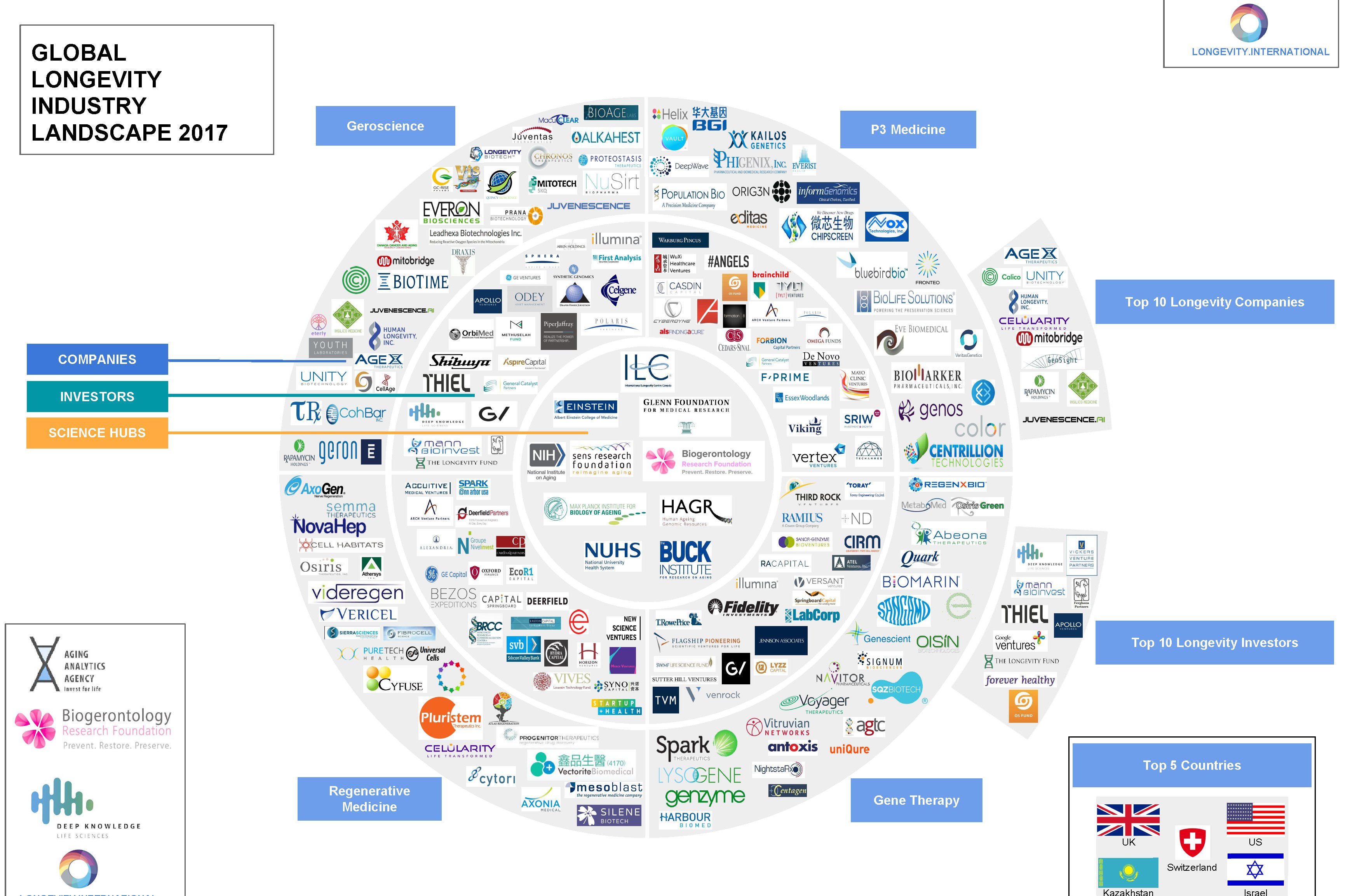Appunto perché è una scommessa che si vince facilmente, quella sul futuro delle società occidentali ha già attratto una legione di amanti del rischio che da diversi anni investono più o meno massicciamente su una serie di prodotti e servizi che spaziano dalla medicina alla finanza e che hanno in comune un pensiero molto semplice: far corrispondere all’allungamento della vita un aumento degli anni in cui si vive in salute. Ciò allo scopo di favorire una profonda riconfigurazione non solo dei sistemi sanitari, ma anche di quelli finanziari, passando dai mercati del lavoro, che certo non rimarranno indenni dagli effetti del silver tsunami. Per dare un’idea di quanto sia popolata l’industria della longevità, non c’è nulla di meglio di questo colpo d’occhio.
