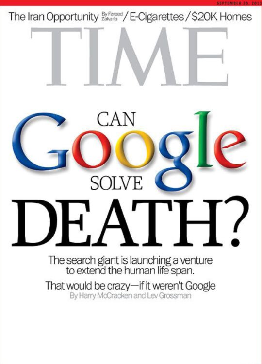 Questo intento è rimasto confinato nello spazio dei sogni a lungo. Le geroscienze sono state considerate una branca minore della medicina sin dagli anni ’40 del XX secolo, quando iniziò la ricerca genetica, e così rimase per diversi decenni. La ricerca scientifica, aveva già fatto importanti passi in avanti, ma solo di recente la tecnologia è stata in grado di far corrispondere alla teoria alcune realizzazioni pratiche , immaginando terapie basate sulla rigenerazione cellulare. Ma siamo praticamente già ai giorni nostri. Il 2013 vede il primo colosso hi-tech investire in grande stile sulle biotecnologie. L’idea venne a Google, che quell’anno presentò Calico, un acronimo che sta per California Live company, una società espressamente dedicata all’allungamento della vita umana grazie allo sviluppo della tecnologia. L’avvento di Google dette un’improvvisa aria di ragionevolezza a un obiettivo fino ad allora confinato nelle frange più visionarie delle aziende biotecnologiche. La copertina di Time del settembre 2013 rende bene la portata dell’evento.