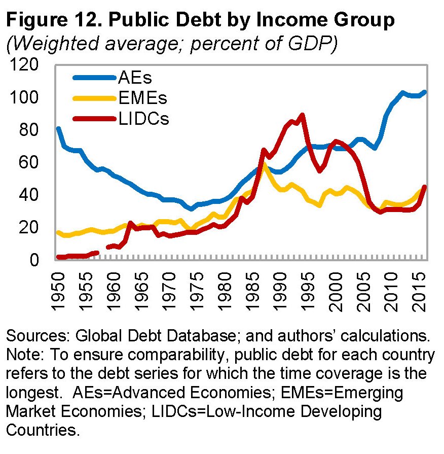 Anche qui, i paesi avanzati hanno visto la crescita maggiore dei debiti pubblici, ormai superando il 100% del pil persino superiore a quello anteriore al 1950, quando ancora gli stati avevano sul groppone i costi della guerra. I paesi emergenti raggiunsero il picco negli anni ’80, al 63% del pil e da allora hanno compiuto, spinti anche dalle varie crisi, grandi sforzi di consolidamento per riportare i ratios sotto controllo.