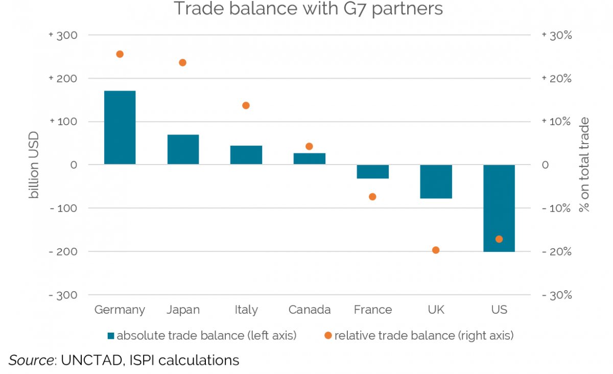 Il G7 e la guerra commerciale. Il tema del commercio internazionale, minacciato dai dazi statunitensi, ha trovato spazio nell’agenda del G7. Un grafico preparato da Ispi ci mostra quali sono le posizioni delle bilance commerciali dei grandi sette.