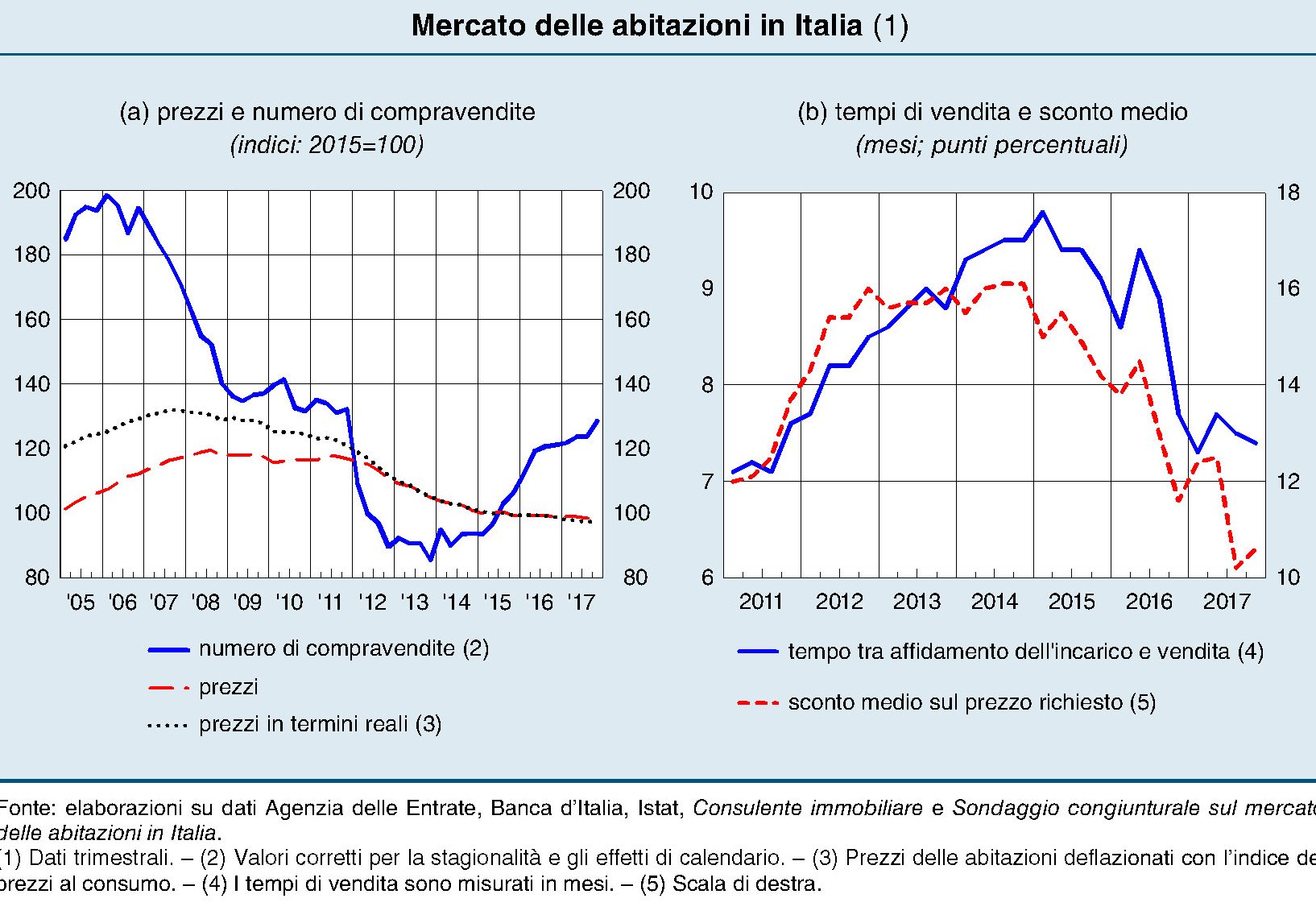 L’indice dei prezzi reali, infatti, è sostanzialmente congelato, con tendenza al ribasso, al livello del 2015, che corrisponde a quello dei prezzi nominali di dieci anni prima. Ciò a fronte di redditi reali che Bankitalia calcola ancora inferiori di circa il 10% a quelli del 2006. La quota 100 del mattone sembra molto difficile da superare.