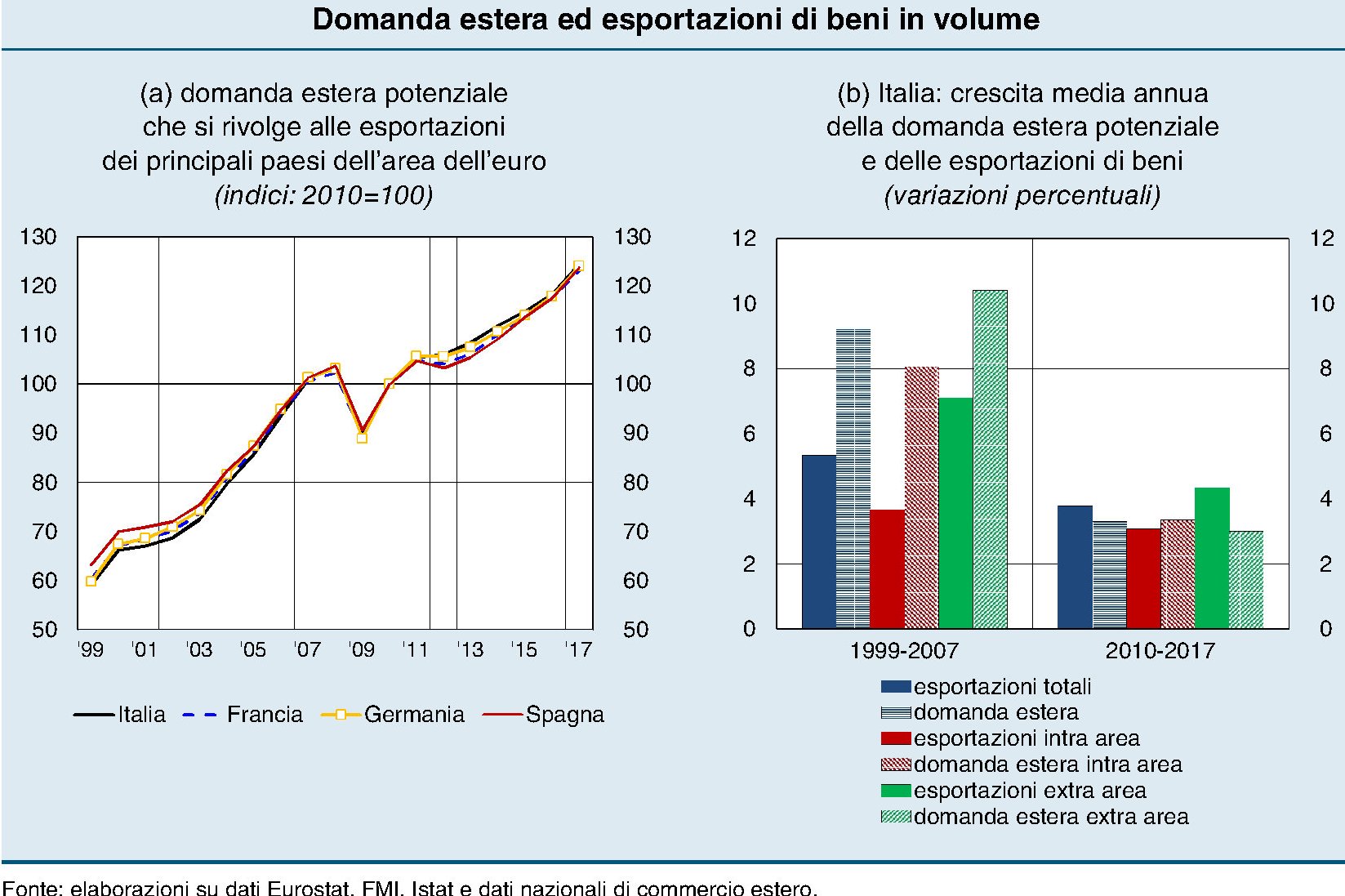 “Tra il 1999 e il 2007 – scrive Bankitalia – la domanda nei mercati di sbocco dell’Italia è cresciuta poco più che in quelli degli altri principali paesi dell’area dell’euro; l’insoddisfacente performance relativa del nostro paese non è quindi imputabile a una concentrazione delle vendite, rispetto ai concorrenti, in mercati meno dinamici. Le esportazioni italia sono aumentate in questo periodo di circa la metà rispetto alla domanda estera. Il divario si osserva sia sui mercati esterni all’area euro sia, in modo più marcato, su quelli interni”. Questa situazione cambia radicalmente a partire dal 2010. Da quell’anno “le vendite all’estero complessive sono cresciute più della
