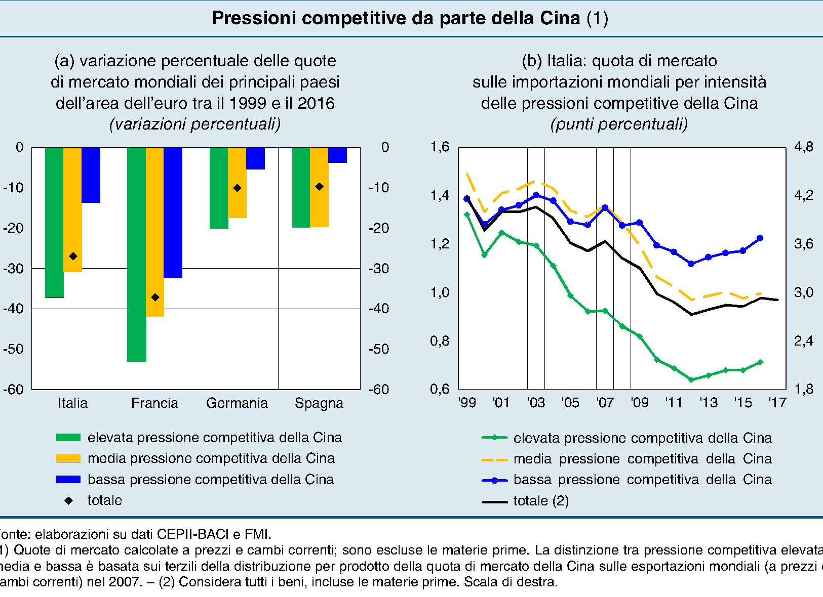 In pratica fino al 2007 “il calo della quota di mercato, pari a 0,6 punti percentuali rispetto al 1999 nella valutazione a prezzi e cambi correnti, è quasi del tutto riconducibile ai prodotti più esposti alla concorrenza cinese”. Dal 2010 invece “si osserva una reazione delle imprese manifatturiere italiane”, e ciò accaduto in virtù di un cambio sostanziale delle esportazioni: “La specializzazione si è spostata verso settori più avanzati, come gli autoveicoli e la farmaceutica: il peso delle produzioni maggiormente esposte alla concorrenza cinese si è ridotto tra il 1999 e il 2010 di quasi un quarto”. A ciò si è aggiunto il miglioramento della capacità competitiva, che ha favorito il recupero delle quote di mercato, a partire dal 2012, anche nei settori in cui è più forte la concorrenza cinese”.