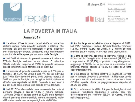 Dichiarante uno e dichiarante due sono ormai contributori fissi delle nostre giornate come il caffé la mattina, la colazione di mezzodì e la cena al vespro, con tanto di borborigmi e deiezioni conseguenti. Sono una certezza. Ma non sono i soli ad aver dichiarato sulla povertà, figuratevi: si è scatenata la solita canizza. Tutti a cantare Povera Italia, che porta voti facili e incredibile popolarità in un paese che crede ancora alle favole e a Babbo Natale, purché sia residente a Montecitorio. Ma di leggere queste benedette definizioni, manco per sogno. Sicché ora ve le copio qua e se proprio volete cantare anche voi Povera Italia almeno cantate intonati con l’Istat, che sa quel che dice a differenza di quelli che ne parlano.