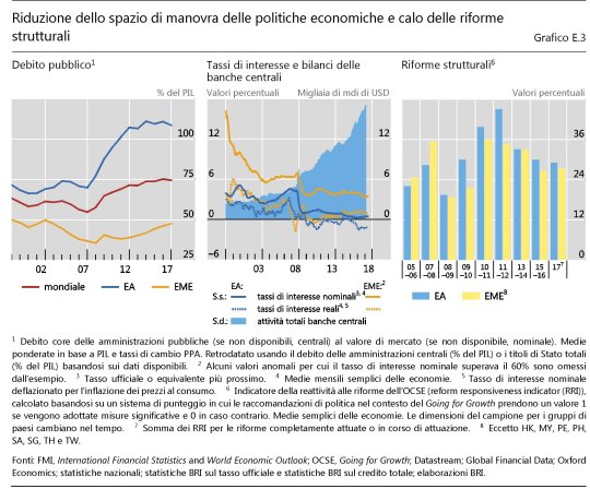 E questo è uno dei problemi più rilevanti. Gli spazi di intervento, anche a causa del notevole aumento dei debiti, si sono drasticamente ridotti, sia a livello fiscale che monetario. L’espansione ancora in corso, alquanto inusuale per alcune caratteristiche – emergono i limiti di capacità produttiva, senza che vi siano segnali chiari di un rischio di inflazione – non può celare una notevole quantità di rischi annidati dietro l’ottimismo delle previsioni. Nell’ultimo anno il dollaro si p svalutato, ad esempio, e ciò ha favorito la crescita dell’indebitamento in dollari dei paesi emergenti. Ma adesso l’aria sta cambiando nel mercato valutario e questo non sarà scevro di conseguenze per questi paesi. “I rischi sono sostanziali – scrive la Bri – nei paesi con vulnerabilità finanziarie si sono accumulati con le loro usuali gradualità e persistenza”. Nulla è davvero cambiato, insomma, stiamo proseguendo un ciclo che somiglia pericolosamente a quello precedente che è iniziato con il calo a lungo termine dei tassi di interesse. Non sono solo gli ultimi dieci anni, quindi, ma molti di più quelli che dobbiamo osservare per comprendere gli esiti della GCF.
