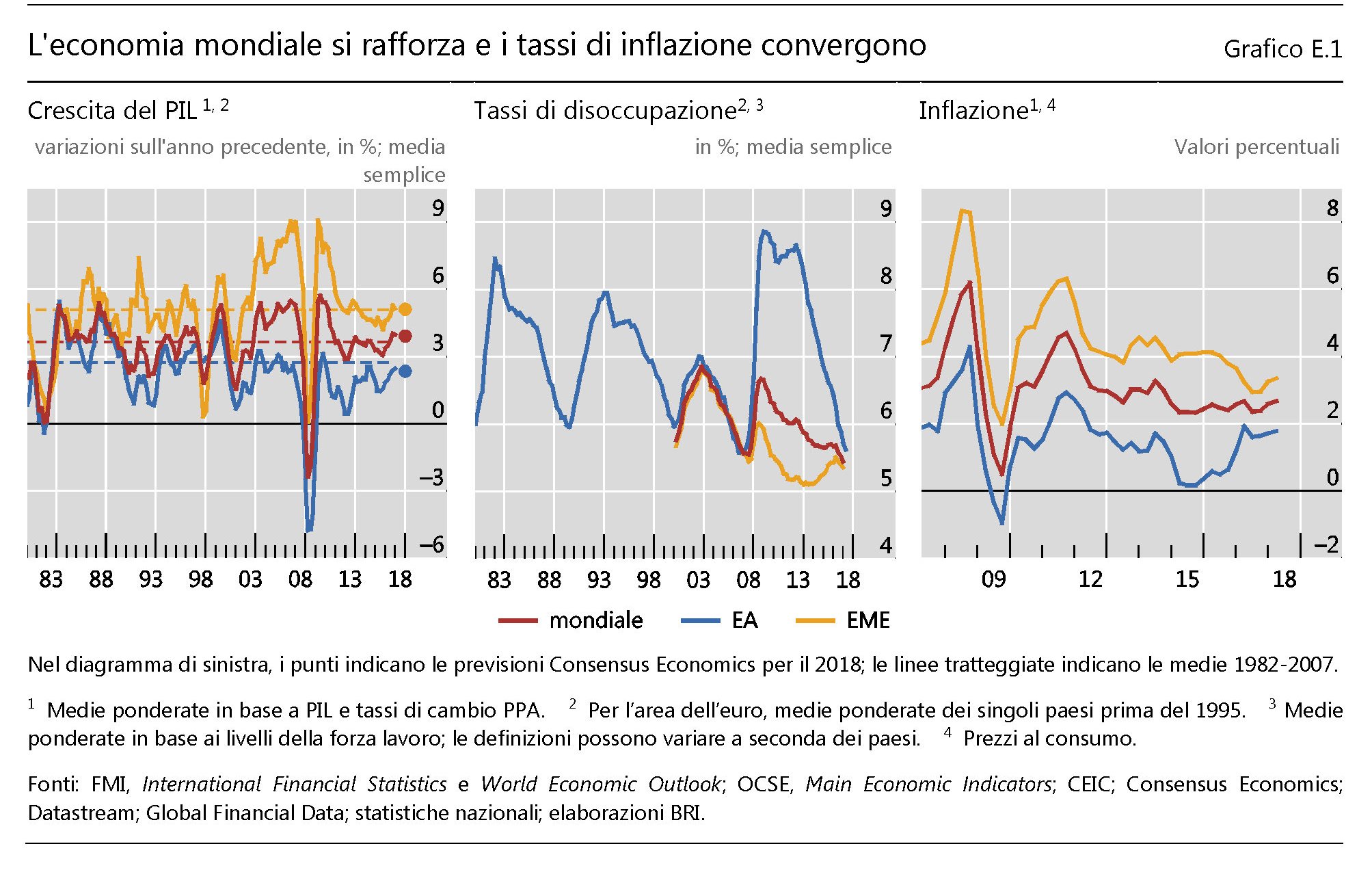 In sostanza l’economia sta marciando bene. I tassi di crescita si sono allineati alle media di lungo periodo,la disoccupazione diminuisce e l’inflazione, grande preoccupazione dei policy maker, dà segnali di risveglio. Da qui il commento della Bri che invita ad “approfittare delle condizioni favorevoli per mettere in atto una combinazione di politiche più equilibrate volte a sostenere un’espansione sostenibile”, nella consapevolezza che “il sentiero che ci troviamo di fronte è stretto”.