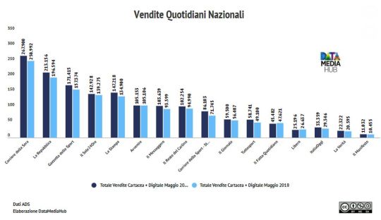 Notate che parliamo di vendite che sommano digitale e cartaceo e poi fatevi il segno della croce e magari recitate una prece. Dico a voi, cari Governanti, lo so che odiate giornali e giornalisti per mille giustissime ragioni, ma sempre posti di lavoro sono. E poi se non le pubblicano i giornali sovrani le vostre facce belle, ma chi lo fa?