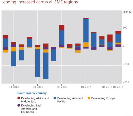Fra i paesi avanzati primeggiano le banche giapponesi, che hanno aumentato i loro prestiti dell’8% su base annua, a fronte dell’aumento del 4% delle banche Usa. L’aumento dell’attività bancarie è stato trainato in piccola parte anche dai prestiti al settore non finanziario, in particolare ai governi, con una crescita del credito a questo settore di circa il 3% nell’anno finito a marzo 2018. La ripresa dei prestiti ai paesi emergenti è dovuta in gran parte alla Cina, che ha assorbito la metà delle risorse finite in Asia nel primo trimestre 2018, mentre in America Latina la parte del leone l’ha fatto il Brasile, che ha assorbito 11 miliardi.