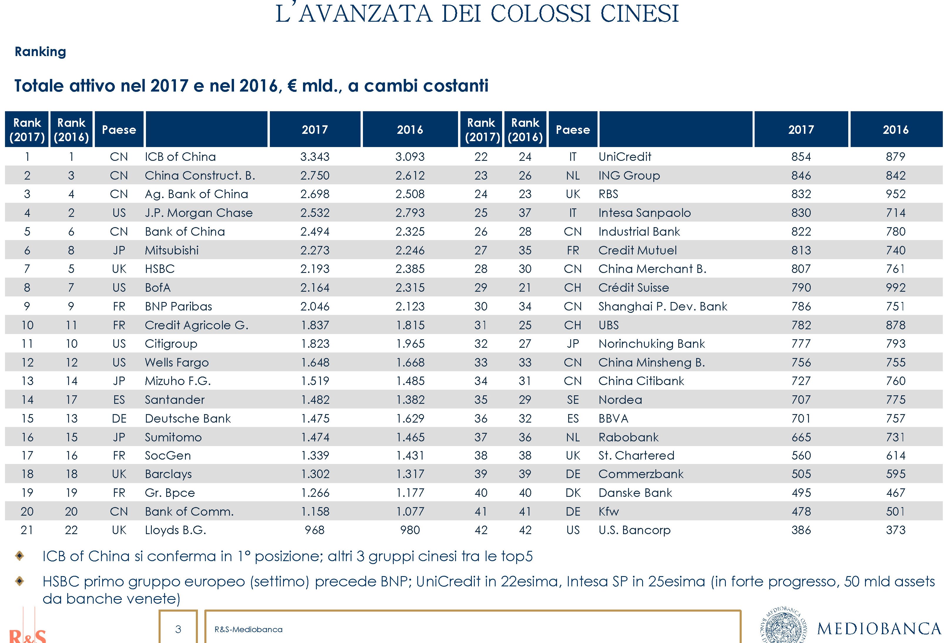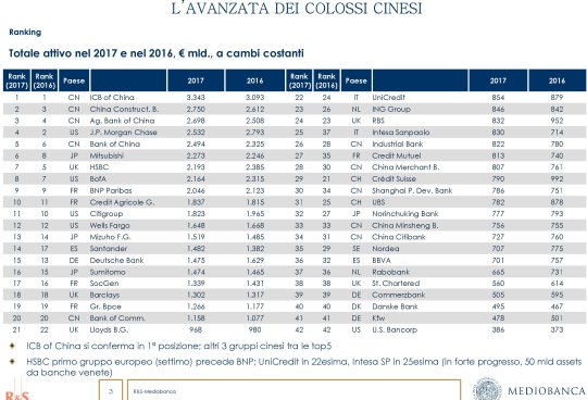 Chiedersi che mondo sarà quello dove le banche cinesi, ormai dinosauri globali, dominano la classifica delle banche internazionali significa semplicemente imparare a leggere il presente. Il tramonto bancario dell’Occidente è solo l’ennesima declinazione di quello più generale che si esprime con grande chiarezza con la seduzione autarchica e interventista che dilagano lungo la piramide sociale con la forza di un contagio. E’ il fallimento delle élite, prima ancora che quello dell’economia, ad alimentare il populismo occidentale. Dall’altro lato della storia l’Oriente, che oggi come ieri rima sghembo con la Cina, alimenta un sistema bancario ormai onnipresente che cresce all’ombra dello stato. L’élite cinese predica il commercio globale sotto l’egida di un governo benigno, come ai tempi dei suoi grandi e numerosi imperi. Le banche, sentitamente, ringraziano.