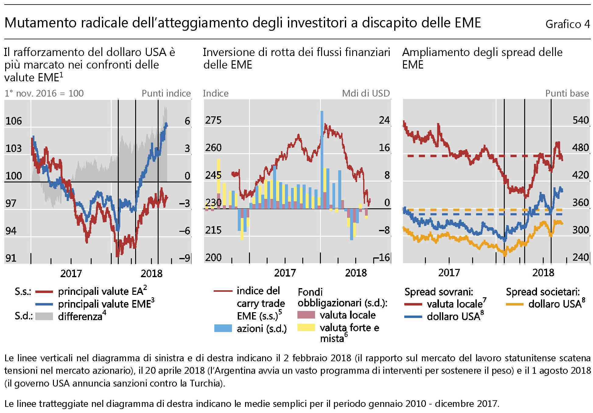 Ora che il Signor Dollaro rialza la voce, apprezzandosi a dispetto di ogni previsione e calcolo, le prime a cui si chiede il conto sono le economie emergenti, che oggi si abbreviano in EME come ieri si chiamavano Brics. Da allora a oggi è cambiato che non ci sono solo Brasile, Russia, India, Cina e Sudafrica, che componevano l’ormai desueto acronimo, a segnalarsi per promesse ed eccellenze prossime venture. Ormai sono numerosissime queste EME. C’è tutta l’Asia che non parla cinese. Il Sud America che non parla portoghese. Il centro europa orientale che non parla russo, e così via dicendo. Ci sono anche la Turchia del miracolo economico a debito in valuta estera e l’Argentina. Tutte Grandi Promesse, che però scoloriscono facilmente al primo starnuto dei mercati valutari o non appena lo Zio Sam flette i muscoli. Lo abbiamo visto nel 2013, quando la Fed ventilò una prima ipotesi di normalizzazione monetaria e bastò quello, e nel 2015, quando si svalutò lo Yuan. C’è tutta una letteratura sulle crisi sofferte dai paesi in via di sviluppo, emergenti o come si voglia chiamarli, generate in qualche modo dal peso specifico dei paesi ricchi. Basta un soffio e i paesi emeriti ritornano semplicemente EME. E cominciano i guai.