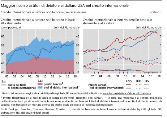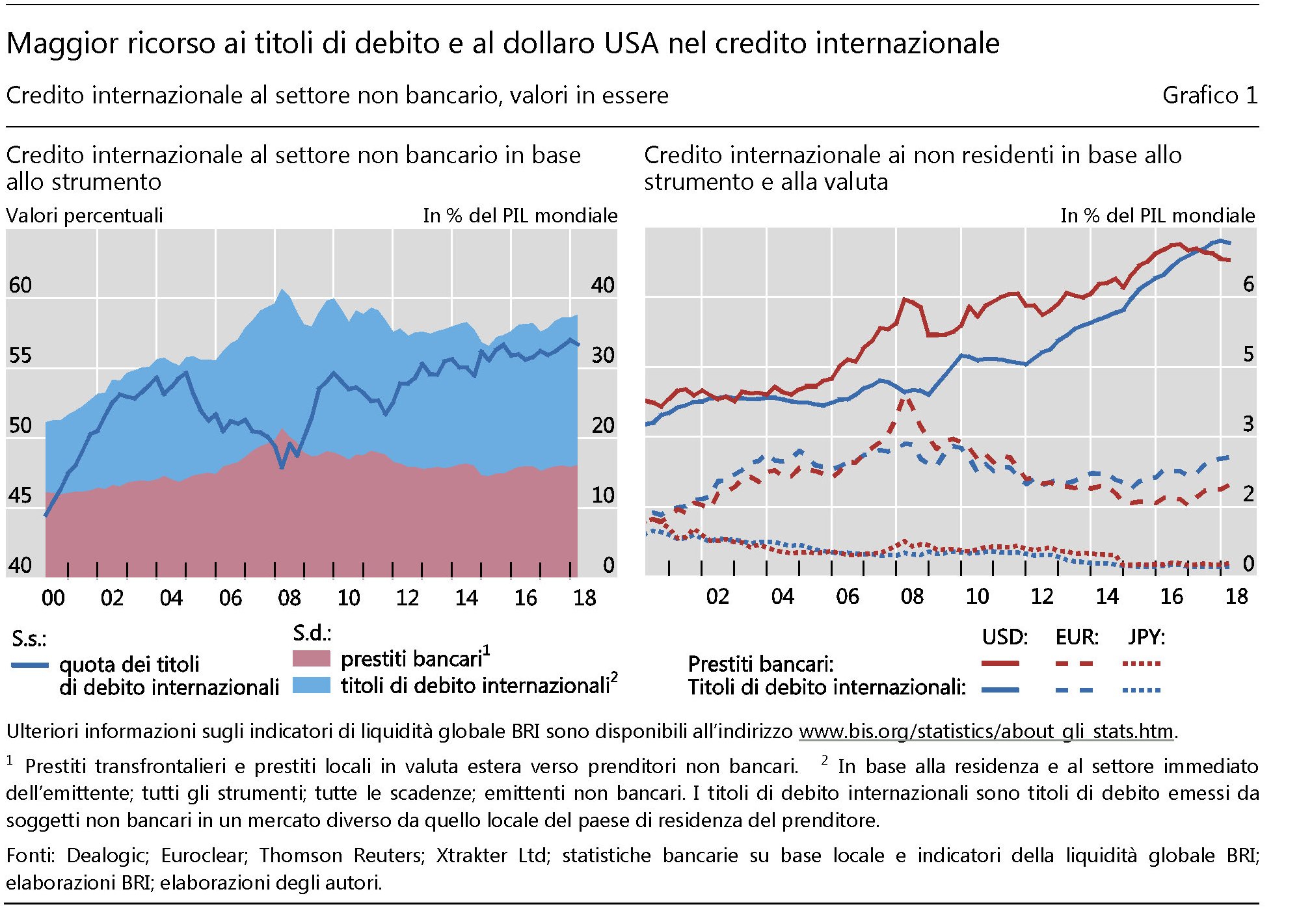 Come introduzione basta osservare che il credito internazionale è notevolmente cresciuto in volume portandosi al 38% del pil mondiale nel primo trimestre 2018, equivalenti all’incirca a 30,7 trilioni di dollari, quando era il 33% appena tre anni prima. Per chiarezza è bene ricordare che questa misura raccoglie i prestiti bancari e i titoli di debito, e che ha come controparte i prenditori non bancari, quindi imprese, governi e famiglie. Ma, aldilà della dimensione di questa montagna di denaro, l’evidenza più interessante è un’altra: “Nella composizione del credito internazionale è avvenuto uno spostamento dai prestiti bancari verso i titoli di debito, la cui quota sul totale è passata dal 48% del 1° trimestre 2008 al 57% del 1° trimestre 2018”. Significa in pratica che i debitori prendono a prestito sempre più dal mercato e sempre meno dalle banche. Queste ultime hanno sempre meno titoli di debito nei loro portafogli. Erano il 40% dei loro attivi dieci anni fa e sono diventate il 27% a fine marzo 2018. Le banche hanno alleggerito i loro bilanci cedendo questi asset e così facendo sono diventate meno determinanti per il credito internazionale. Questa è una trasformazione molto interessante da osservare perché implica svariate conseguenze, a cominciare da chi siano i soggetti sui quali ricadono in ultima analisi i rischi.