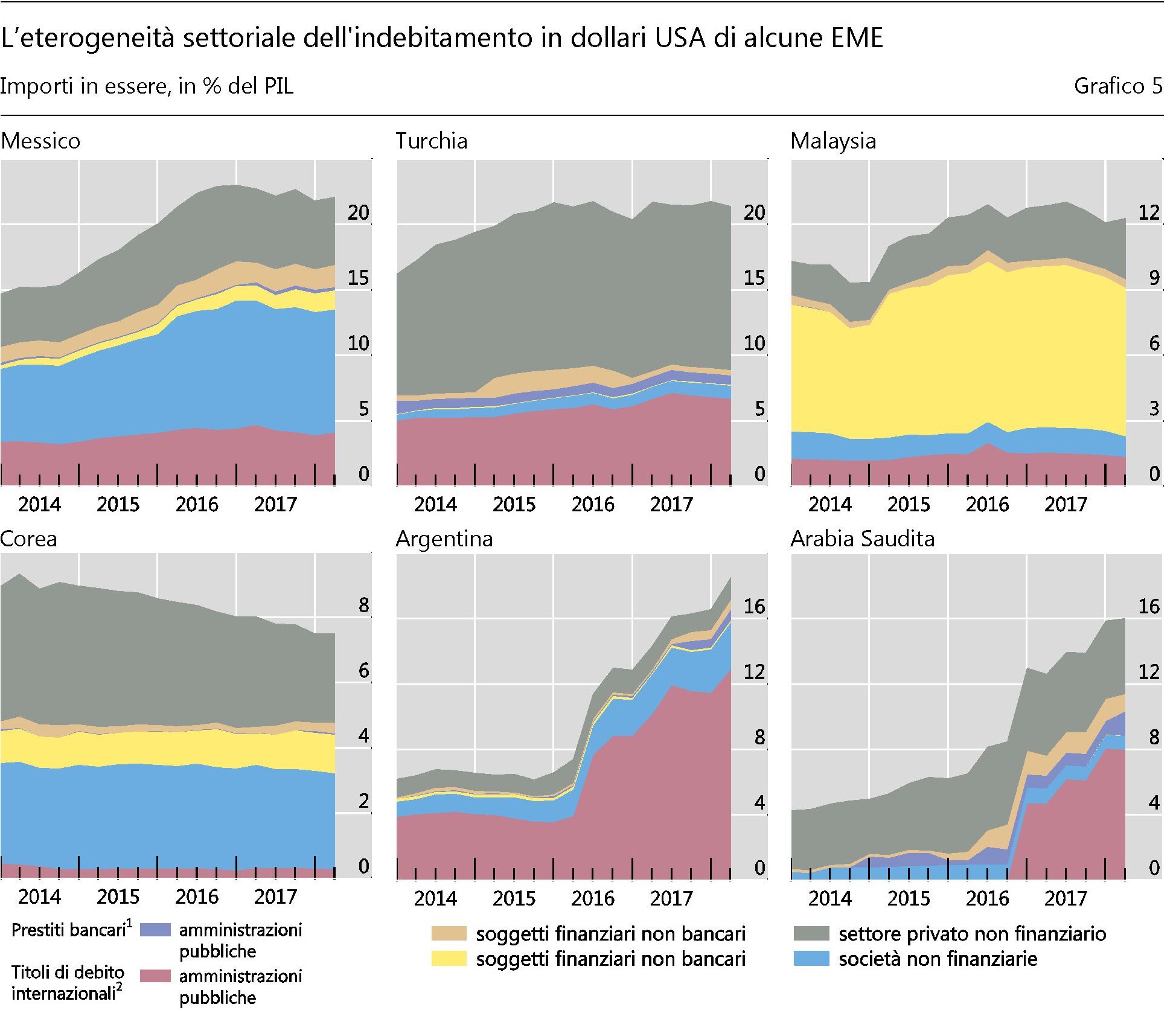Capire come si sia arrivati a questo punto è interessante. Ma soprattutto è utile provare a ragionare su come queste trasformazioni possano impattare sul funzionamento dei mercati. Più titoli di debito e più dollari, ad esempio, implica che “a livello mondiale le condizioni di finanziamento siano diventate più sensibili agli andamenti dei mercati obbligazionari e maggiormente dipendenti dalla politica monetaria degli Stati Uniti” e che “i prenditori delle EME che sono ricorsi massicciamente ai titoli di debito denominati in dollari USA potrebbero risultare particolarmente vulnerabili, poiché gli investitori obbligazionari internazionali tendono a ritirarsi in fretta quando i tassi statunitensi salgono”. Va anche considerato il fatto che l’esposizione in dollari non cambia solo i diversi paesi ma anche fra i vari settori. Il settore corporate privato, in tal senso, “è stato il principale prenditore di dollari Usa” per diverse economia emergenti, mentre per altre è stato il settore statale.