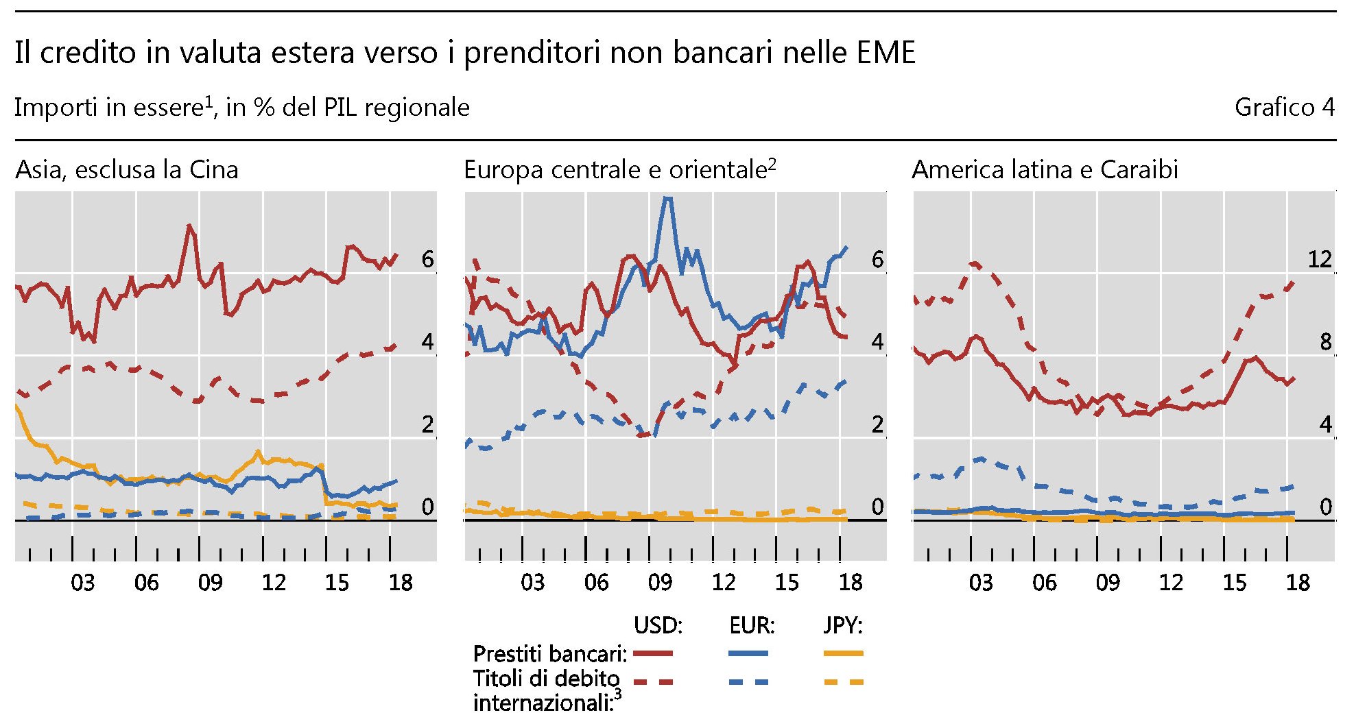 Se guardiamo alla geografia, osserviamo che la contrazione dei prestiti bancari è stata trainata da quattro paesi, ossia Francia, Germania, Regno Unito e Stati Uniti. Questa retromarcia non ha impedito ai paesi emergenti di cumulare grandi quantità di debiti in dollari, collocati però in gran parte al di fuori del circuito bancario. Tali esposizioni peraltro non sono distribuite uniformemente. “Nell’Asia emergente, il credito denominato in dollari USA aumenta dal 2010 – sotto forma sia di titoli di debito sia di prestiti bancari; nell’Europa centrale e orientale, storicamente il credito denominato in euro ha un ruolo relativamente più importante. Eppure il dollaro domina anche in questa regione, nonostante il forte rialzo del credito denominato in euro dal 2015. In America latina storicamente prevale il credito denominato in dollari USA, che ha registrato un notevole incremento dal 2010, trainato dall’emissione di titoli di debito”.