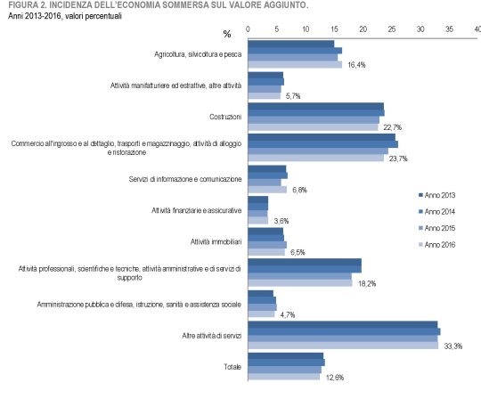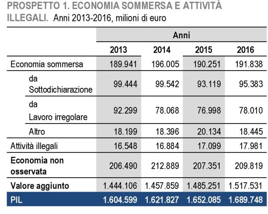 La nota Istat è una compilazione delle nostre furbizie. Per dire: il sommerso, ossia quella galassia di comportamenti non spiccatamente criminali ma semplicemente “furbi” – l’abusetto edilizio, lo scontrino in bianco, il lavoretto in nero – pesano 11 volte (192 miliardi) il valore delle attività illegali (18 miliardi) propriamente dette. Le sotto-dichiarazioni, ossia quel vasto elenco di comportamenti che costituiscono elusione o evasione fiscale, rappresentano il 45,5%. Un altro 37,3 riguarda irregolarità collegate al lavoro. Abbiamo un mercato del lavoro con bassi tassi di partecipazione, duale (a dire poco) e stra-tassato, e poi un paradiso fiscale lavorativo dentro casa. Per dire: nel 2016 i lavoratori irregolari erano 3 milioni 701 mila, in prevalenza dipendenti (2 milioni 632 mila), in lieve diminuzione rispetto al 2015 (rispettivamente -23 mila e -19 mila unità). Il tasso di irregolarità, calcolato come incidenza delle unità di lavoro (ULA) non regolari sul totale, era pari al 15,6%. E pensiamo pure ai redditi di cittadinanza.