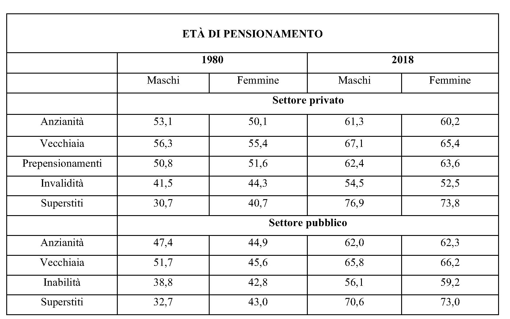 Per le pensioni con decorrenza “1980 e anni precedenti”, ancora vigenti all’1.1.2018, l’età media alla decorrenza dei maschi è 49,4 anni e quella delle femmine è 43,8 anni”.