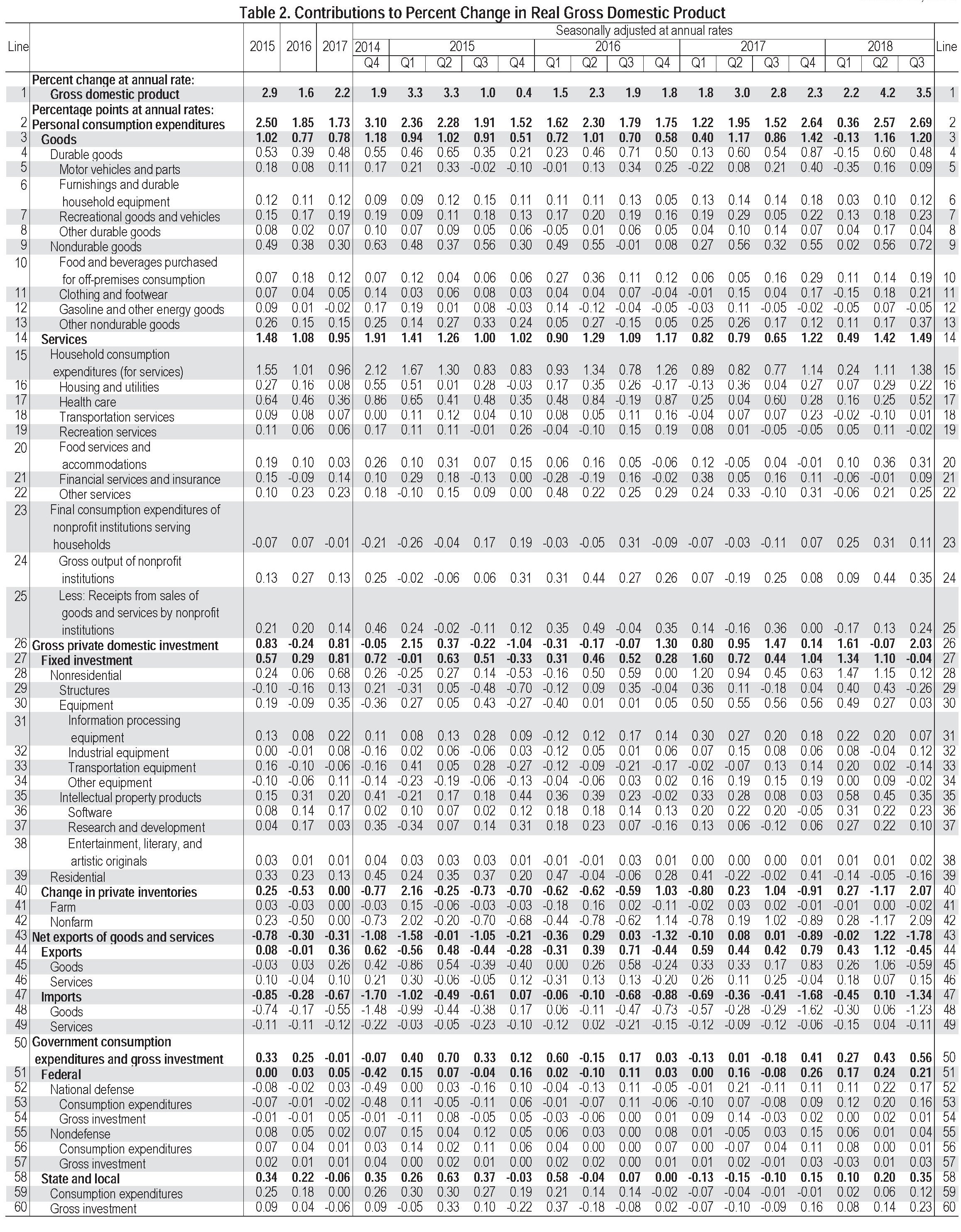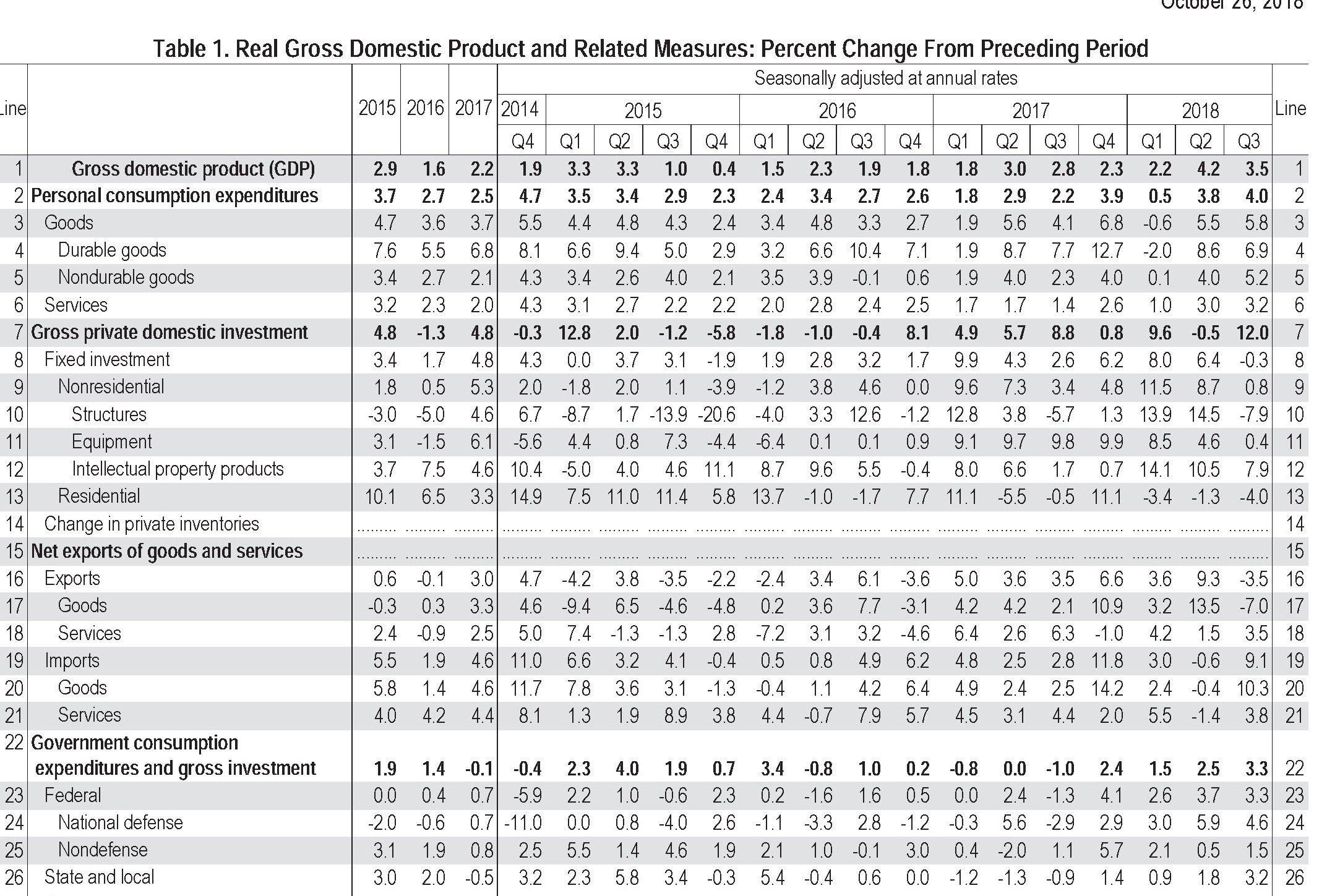 Al di là del numeretto, è come si ottiene questo risultato che è interessante. La nota dell’ufficio statistico governativo lo spiega con chiarezza. “L’incremento riflette il contributo positivo dal consumo privato (PCE. personal consumption expenditures), gli investimenti in scorte, la spesa pubblica del governo e degli enti locali e gli investimenti fissi non residenziali”. Tale contributo è stato contrastato dal dato negativo arrivato dal commercio estero e dagli investimenti fissi residenziali. L’import, in particolare, “è aumentato”, a differenza di quanto era accaduto nel secondo trimestre, che era diminuito anche se di poco. Ma ciò che è interessante rilevare è che “la decelerazione nel pil reale nel terzo trimestre riflette un calo delle esportazioni e una decelerazione negli investimenti fissi non residenziali”. La tabella sotto consente di avere una visione ancor più nitida delle varie componenti che hanno determinato il risultato del terzo trimestre.