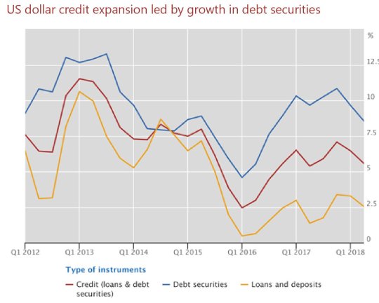 Anche il debito in euro, sebbene per quantità inferiori, fa la sua parte. L’eurodebito concesso ai prenditori fuori dall’eurozona è cresciuto del 7%, sempre nei dodici mesi finiti a giugno 2018, e quota ormai 3,1 trilioni. La crescita, al contrario di quanto avviene per il debito denominato in dollari, è guidata dai prestiti (+8%) più che dalle obbligazioni (+6%).