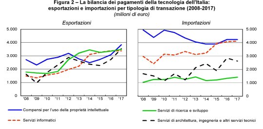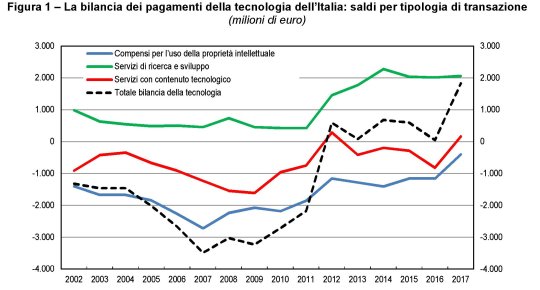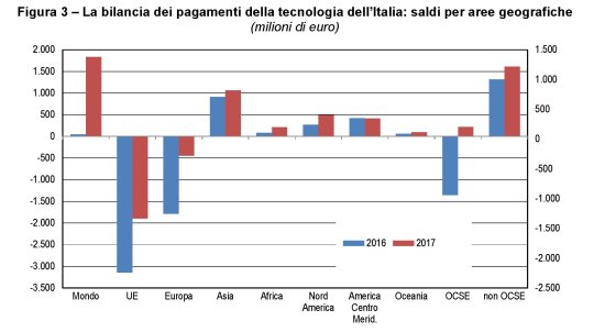 L’analisi di questi dati conduce a informazioni assai interessanti, la prima delle quali è che “nel 2017 il saldo complessivo della bilancia dei pagamenti della tecnologia è risultato positivo per il sesto anno consecutivo, pari a 1,8 miliardi di euro, un livello mai raggiunto in precedenza”. Aldilà del dato, è il trend che è interessante. Negli ultimi sei anni, malgrado la crisi (o forse in ragione della crisi) l’Italia è riuscita a trasformare quello che era un deficit in un attivo.