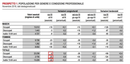 Siete pronti? Eccola qua: a novembre 2018, ci dice l’Istat, sono finalmente aumentati gli inattivi di ben 26 mila unità rispetto a ottobre.