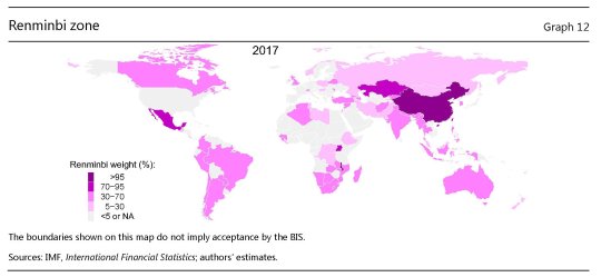 Ma il paper tenta una risposta, basandosi sui tassi di cambio degli anni 2015-17, nell’ipotesi che lo yuan sia già una valuta chiave e quindi sia capace di interferire sui movimenti delle altre valute stimando anche in che misura esse varino rispetto al dollaro, l’euro e lo yen. Se tali tali movimenti esistono – e quindi esiste una relazione più stabile fra la valuta cinese e le altre rispetto a quella che queste ultime hanno con le altre valute chiave – allora anche i conti correnti e la posizione degli investimenti di questi paesi vengono sottratti alle zone del dollaro e dell’euro e “assegnate” a quella dello yuan. Sulla base di queste premesse si arriva alla conclusione rappresentata da quest’altro grafico.