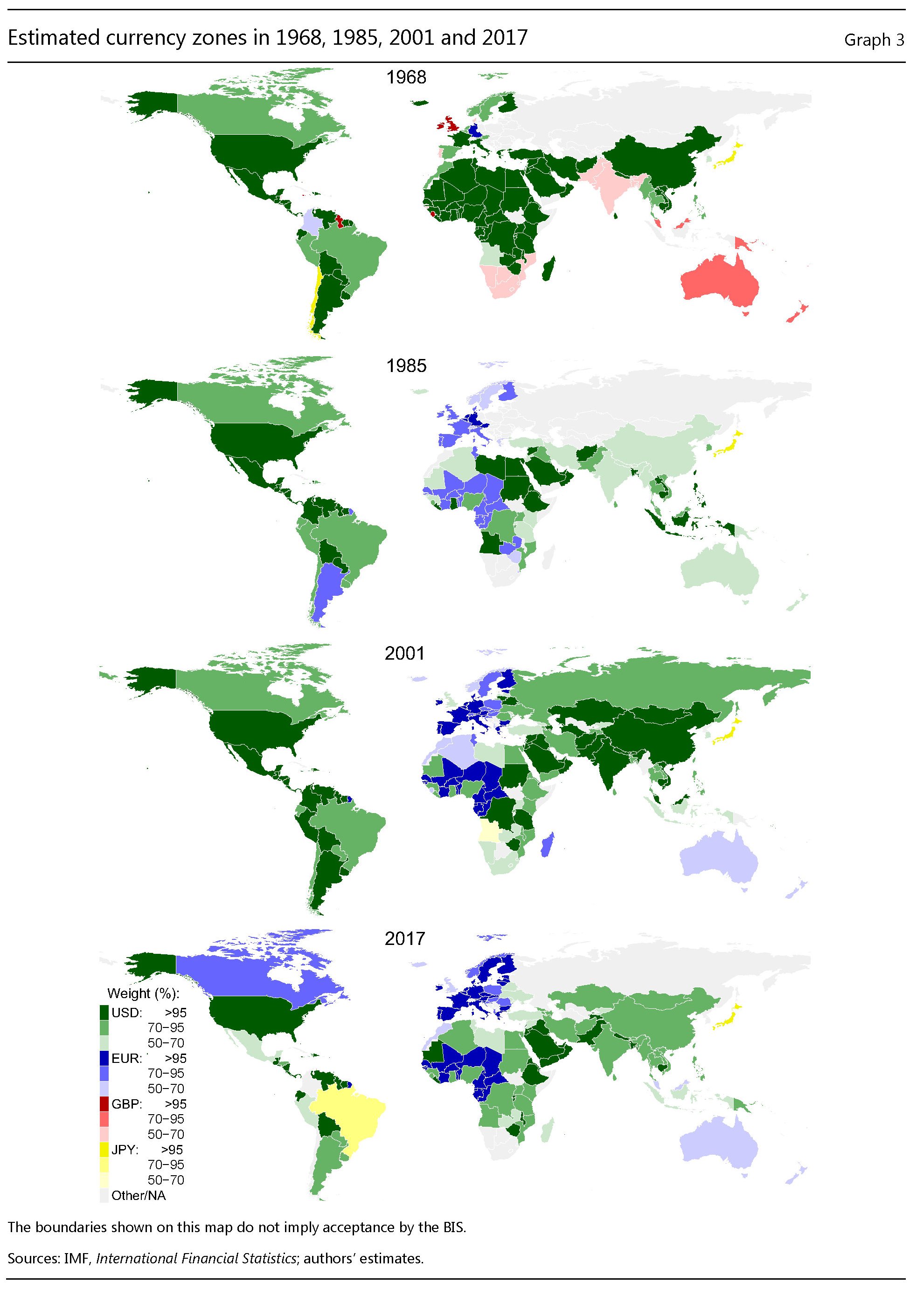 Sono moltissime le considerazioni che potremmo fare basandoci sulle informazioni illustrate in questa rappresentazione delle zone valutarie. A cominciare dalle evidenze più visibili – il costante diminuire dell’area del dollaro – alle curiosità meno appariscenti, come l’ingresso del Brasile nell’area valutaria dello yen dopo decenni di stabile influenza del dollaro. E altre ancora. La Germania stabilmente nell’area del dollaro nel 1968, e poi nel 1985 ormai stabilmente nell’area di influenza della sua moneta, che poi diventerà l’euro, che in quell’anno faceva già capolino in Africa e in Argentina. L’Australia che esce dall’orbita della Sterlina – negli anni ’70 l’area della sterlina smette semplicemente di esistere come zona valutaria – ed entra in un limbo dove pallida si intravede l’influenza del dollaro che cede il passo alla valuta europea. La Russia notevolmente ancorata al dollaro nel 2001 e oggi pressoché fuori da quell’orbita. Il Canada, che dopo decenni di ancoraggio al dollaro vede far capolino l’euro. L’Africa, dove ormai un puzzle valutario ha sostituito la sostanziale monocromia del 1968. La Cina, infine, ancora molto dipendente dal dollaro, ma assai meno rispetto al 2001.