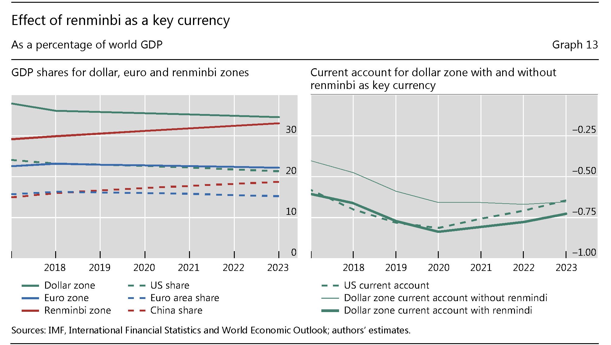 Anche qui, l’osservazione del grafico può condurre a diverse considerazioni. Il paper ce ne propone alcune. Nel 2017, ad esempio, la quota di pil della renminbi zone (RZ) è del 30% del totale. Poi che “la RZ si costituisce a scapito della dollar zone (DZ -20%) più che dell’euro zone (EZ -5%). “Questa evidenza – sottolinea il paper – indica che un mondo diseguale bipolare sta cedendo il passo a un mondo diseguale ma tripolare”. Secondo le proiezioni del FMI i diversi tassi di crescita condurranno la RZ alla parità con la DZ entro il 2023. Ciò significa che la DZ svilupperà deficit correnti crescenti, all’estendersi della RZ. L’emergere dello yuan, per dirla con semplicità genera effetti finanziari destabilizzanti sulla DZ.