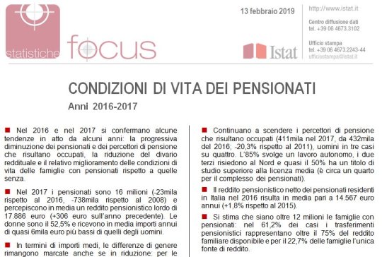 Avete letto bene. Per quanto possa sembrare sconcertante, nel 2017 abbiamo appena 16 milioni di pensionati, ben 23 mila in meno rispetto al 2016 e addirittura 738 mila in meno al 2008. Un’ecatombe. Eravamo un paese di pensionati felici. Ora lo siamo assai meno. E siccome “l’incidenza del rischio di povertà tra le famiglie con pensionati (pari al 16,4%) si conferma sensibilmente inferiore a quello delle altre famiglie (24,0%)”, significa anche che siamo più poveri.