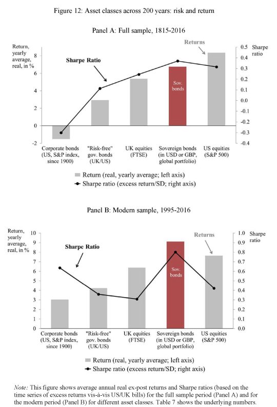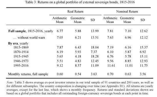 Se avete voglia a vostra volta di inerpicarvi nella storia, assai più di quanto ci si possa riuscire con un post, suggerisco la lettura di un paper pubblicato qualche tempo dal Nber (“Sovereign bond since Waterloo“) che ha il pregio di offrirci uno sguardo sul mercato obbligazionario sin dal 1815, ossia dai tempi di Waterloo, che per gli autori segna un po’ l’inizio del mercato dei bond sovrani. Una storia fortunatissima, pure se funestata da una miriade di default, ristrutturazioni, haircut e svariati altri eventi traumatici, primo fra tutte le guerre. E tuttavia, come si diceva all’inizio, i possessori di titoli obbligazionari, alla fine ci hanno sempre guadagnato, in alcuni momenti anche più delle azioni.