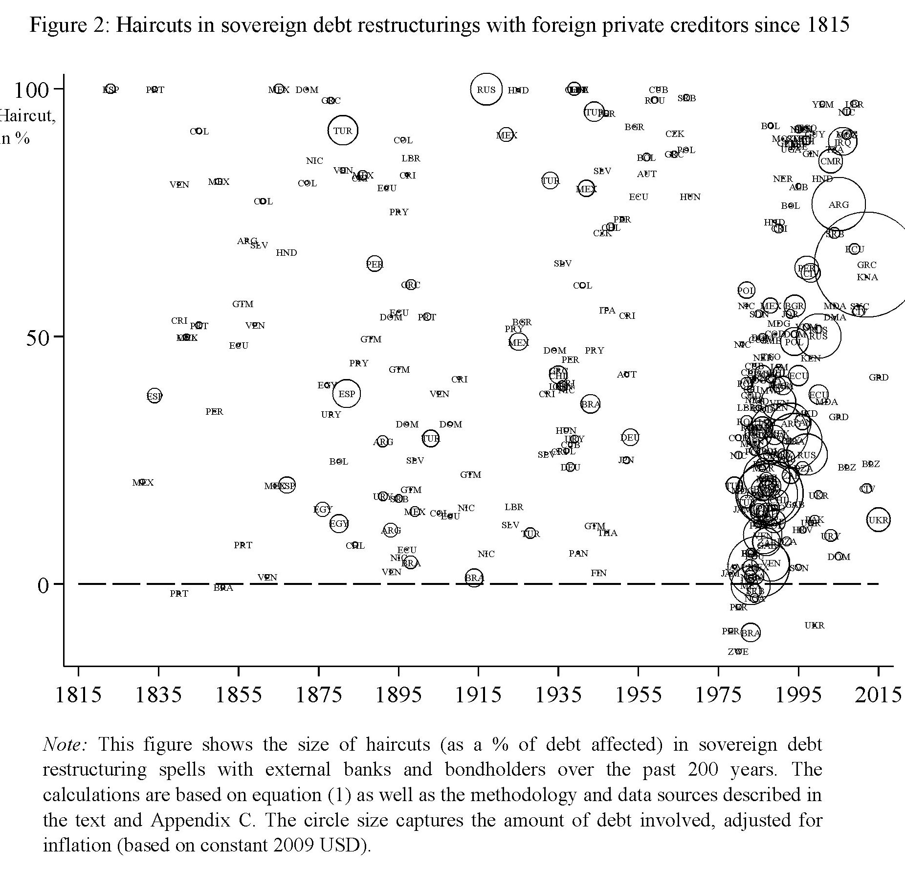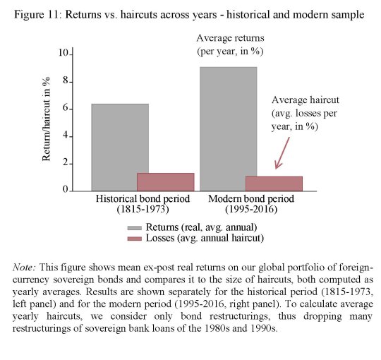 Un’altra informazione interessante che si ricava dal database prodotto dagli autori è che in media anche gli haircut dei prestiti ammalorati non hanno superato il 50%, e spesso in molti casi il default non ha interrotto il pagamento delle cedole. Ha riguardato gli stock ma non i flussi.