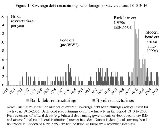 Notate l’impennata degli istogrammi, relativi ai prestiti bancari andati male. La modernità è giovata poco ai creditori. Altresì interessante notare la concentrazione di default sovrani nel ventennio precedente e successivo alla seconda guerra mondiale, cui però è succeduta una certa stabilità entrata in crisi negli anni ’70.