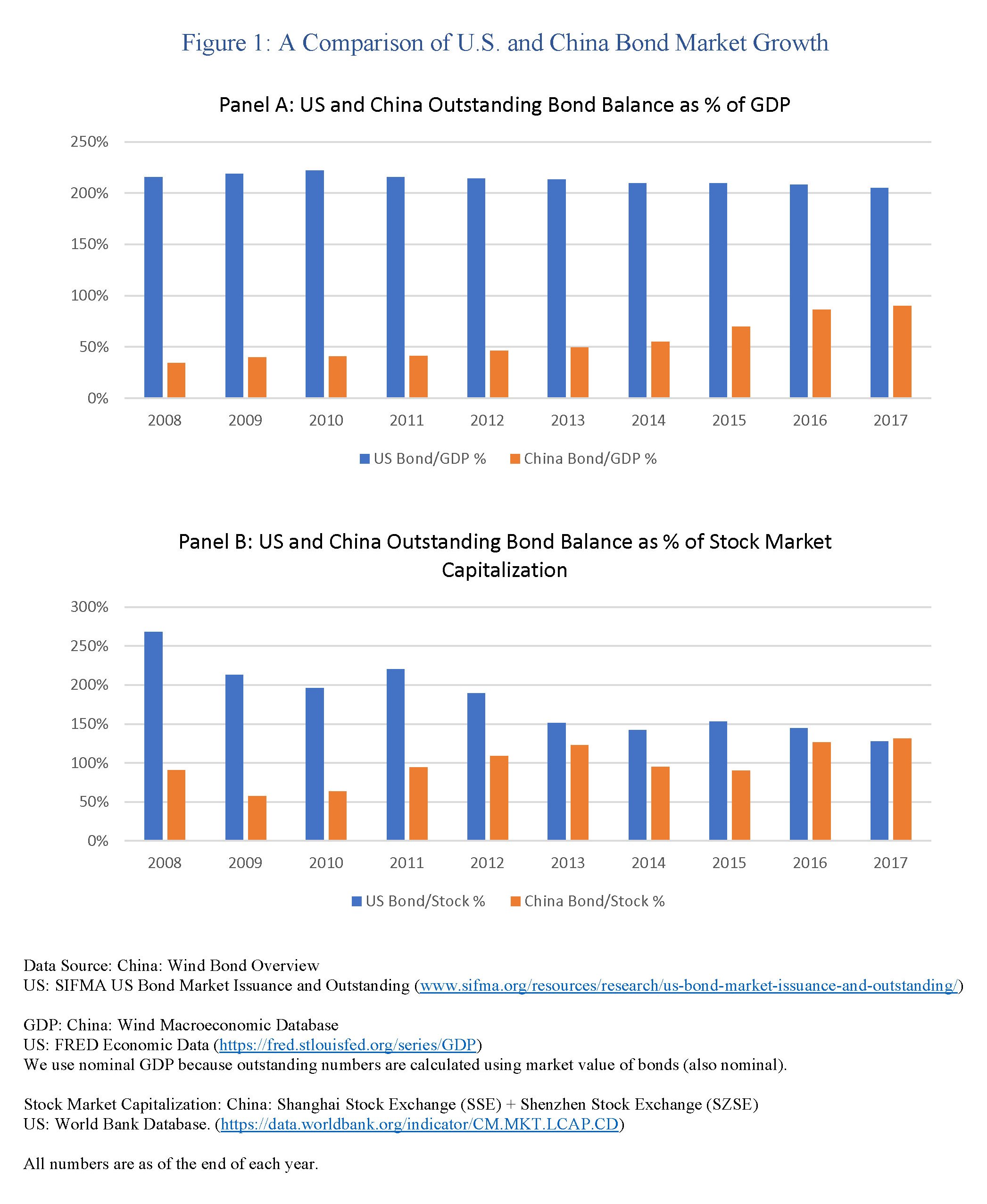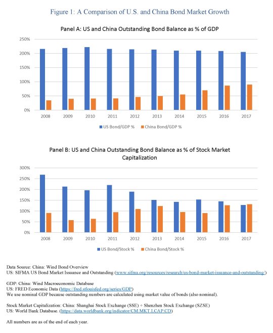 Quello che il grafico sopra non dice, ma che è meglio sapere subito, è che la notevole crescita del settore obbligazionario, che ormai sfiora il 100% del Pil (era il 35% nel 2008) ha condotto a una crescita notevolissima del peso specifico dei bond nei mercati finanziari, arrivando ad eguagliare quello che si registra negli Usa, dove il peso del bond sul pil ormai sta intorno al 200%. Parliamo (dato 2017) di una capitalizzazione che si aggira intorno al 130% di quella delle borse. Significa in pratica che la metà (rispetto al pil) di bond cinesi capitalizzano sui mercati finanziari quanto quelli Usa a casa loro, malgrado il peso dei bond Usa sul pil sia il doppio di quelli cinesi. Teniamolo a mente.