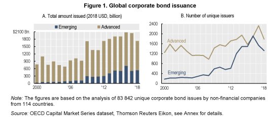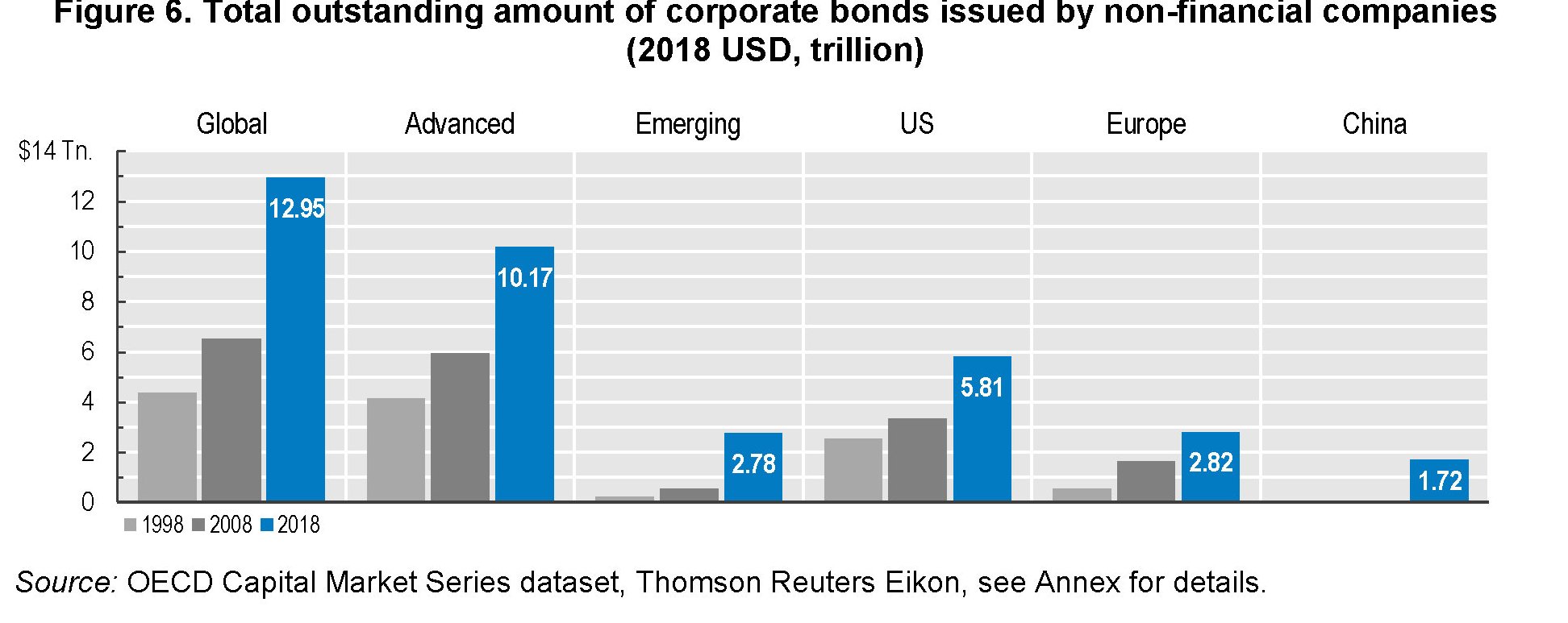 E qui arriviamo alla conclusione. A fine 2018 il totale dello stock dei bond corporate quota quasi 13 trilioni di dollari. Le compagnie dei paesi avanzati oggi ne hanno emesso il 79% del totale, cresciuto del 70%: dai