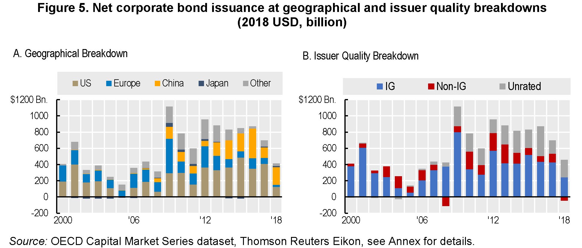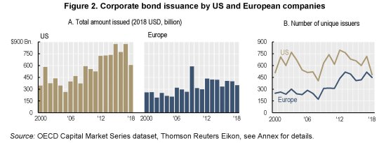 Bisogna tenere a mente questi numeri per una semplice ragione: nei prossimi tre anni le imprese non finanziarie dovranno rinnovare circa quattro trilioni di dollari di bond in scadenza, che equivalgono all’incirca all’intero bilancio della Fed. E questo si prepara in un mondo dove esistono già dei competitori affamati di finanziamenti – in particolare gli stati sovrani che nel 2019 si prevede emetteranno oltre 11 trilioni di dollari di bond – e soprattutto in un contesto di riduzione dell’appetito per il rischio. Basta ricordare che nel 2018 le emissioni di bond corporate sono diminuite del 41% rispetto all’anno precedente, con emissioni nette divenute negative. Il che, secondo Ocse, è un buon indicatore della riduzione dell’appetito degli investitori per questa categoria di obbligazioni.