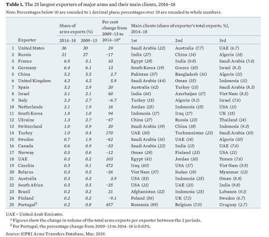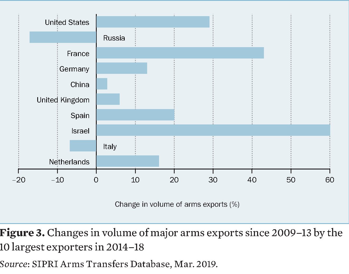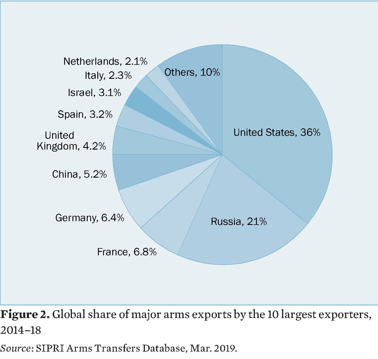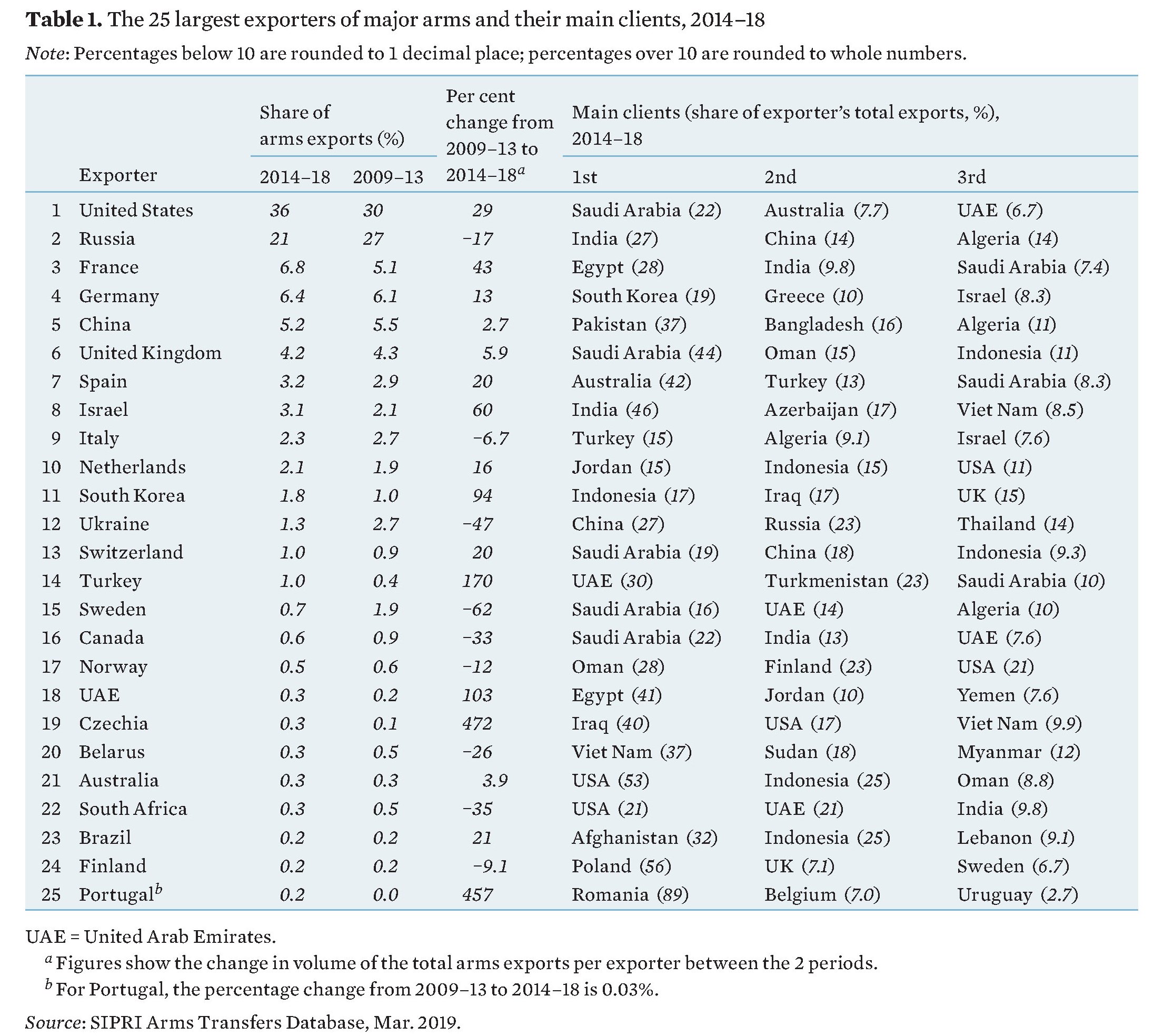 Nei cinque anni trascorsi fra il 2014-18 il volume internazionale di scambi è risultato in crescita del 7,8% rispetto al quinquennio 2009-13, ma ben del 23% rispetto a 2004-08. I primi cinque esportatori dell’ultimo quinquennio sono, dopo gli Stati Uniti, Russia, Francia, Germania e Cina.