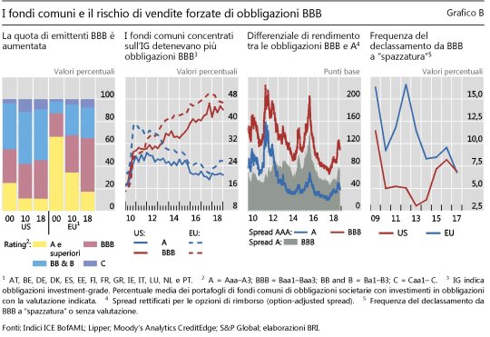 Perché tutto questo ci interessa? Semplice. “I mandati di investimento basati sui rating – spiega la Bis – prevedono che i gestori di portafoglio debbano detenere attività che presentano una qualità creditizia al di sopra di un livello minimo. Tali mandati si applicano spesso ai fondi comuni di obbligazioni societarie, e permettono agli investitori di scegliere facilmente l’esposizione al rischio desiderata, spesso nel segmento investment-grade”. Questa premessa serve a capire cosa sia accaduto in questi anni. Dall’esplodere della crisi, infatti, i fondi comuni che trattano obbligazioni corporate nel segmento IG hanno fatto crescere notevolmente la quota di BBB nei loro portafogli. “Nel 2018 – spiega la Bis -, questa quota aveva raggiunto circa il 45% sia negli Stati Uniti sia in Europa, da circa il 20% del 2010”.