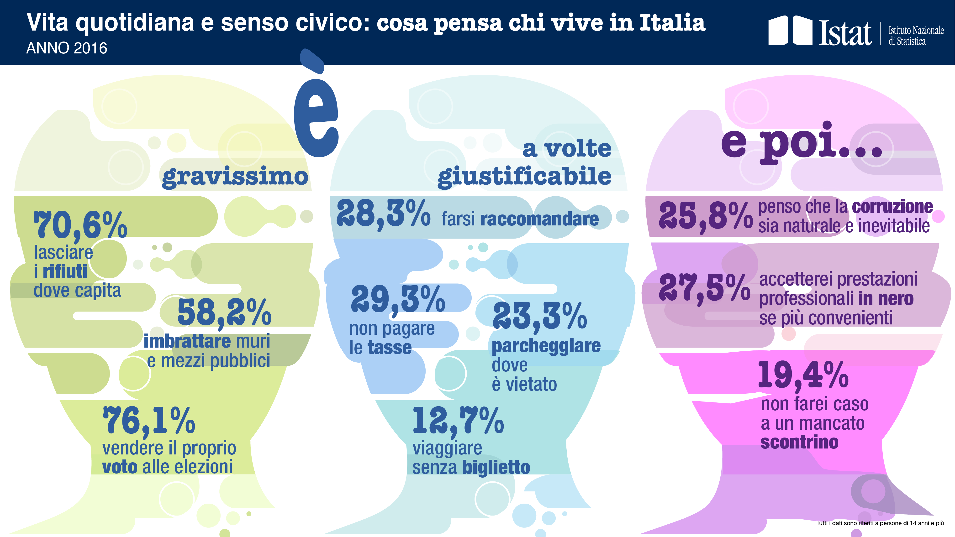 E proprio mentre infuria l’enne-ennesima storiaccia di malversazioni all’italiana, l’Istat tocca una delle sue vette più sublimi regalandoci una ricognizione sul senso civico degli italiani.