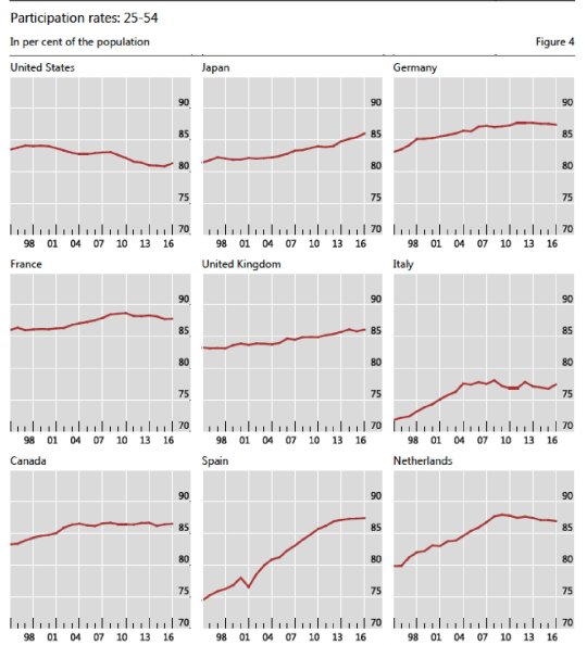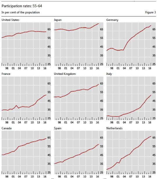 I numeri ci dicono che sei dei sette milioni di posti di lavoro creati nell’area dell’euro tra il 2013 e il 2017 hanno riguardato persone di età superiore a 50 anni. Negli Stati Uniti, la quota di lavoratori sopra i 55 anni nel mondo del lavoro è quasi raddoppiata dal 12% nel 1995 al 23% nel 2016. In Giappone la partecipazione dei lavoratori sopra i 65 anni è aumentata di quasi 4 milioni dal 2007. In media nei paesi Ocse la partecipazione dei lavoratori tra i 55 ei 64 anni è passata dal 33% al 55% nell’ultimo decennio. In Germania è aumentato da circa il 40% fino al 2003 ad oltre il 70% nel 2016.